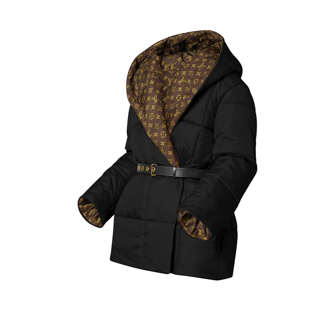 This streetwear-forward spin on a timeless Louis Vuitton short wrap coat takes its cues from the House’s iconic Pillow Boots, cut from quilted nylon ripstop and complemented by an ample hood. Lined with the iconic Monogram motif and defined at the waist with a sleek leather belt.