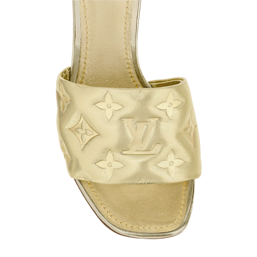 One of Louis Vuitton's emblematic styles, the Revival mule is revisited in soft, metallic lambskin, which is embossed with the House's signature Monogram pattern. This glamorous model features an on-trend square toe and a high heel, while the padded front strap and insole offer extra comfort.