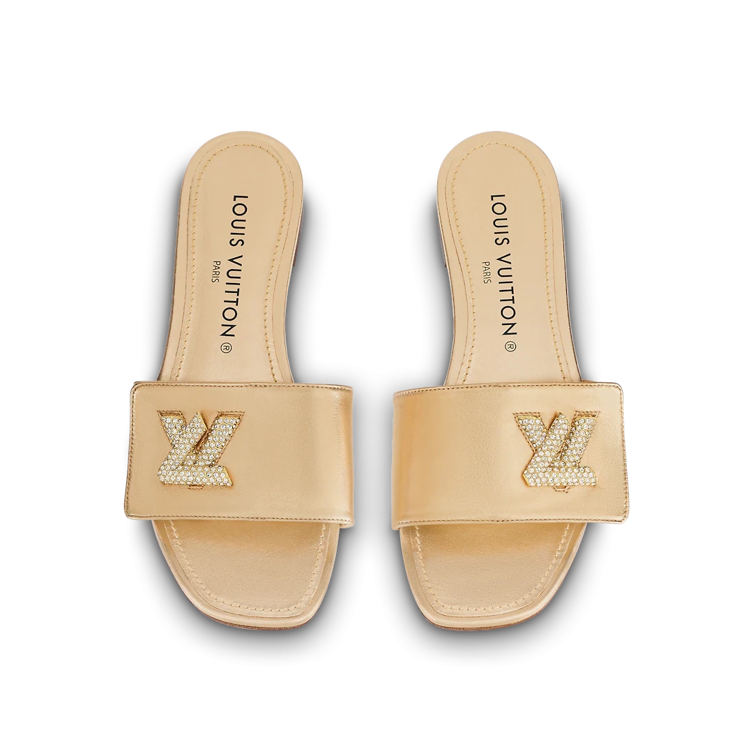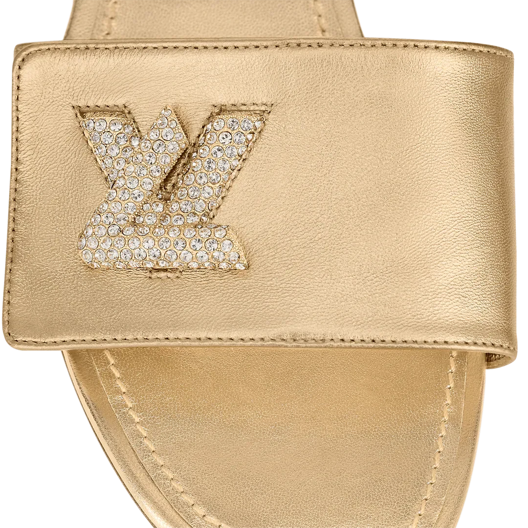The Shake flat mule is crafted from soft, metallic lambskin. Its wide front strap is embellished with a jewel-like LV accessory, entirely covered in sparkling crystals, which was inspired by the clasp of the iconic Twist handbag. This model is finished with a fine leather outsole, while the insole is printed with an oversized Louis Vuitton signature.