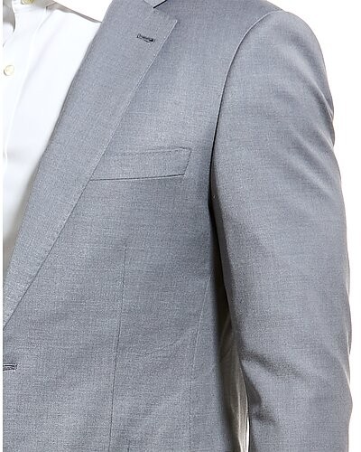 Design details: notch lapel, left chest pocket, two front pockets, non-functional button cuffs, four interior pockets, and side vents at back hem
