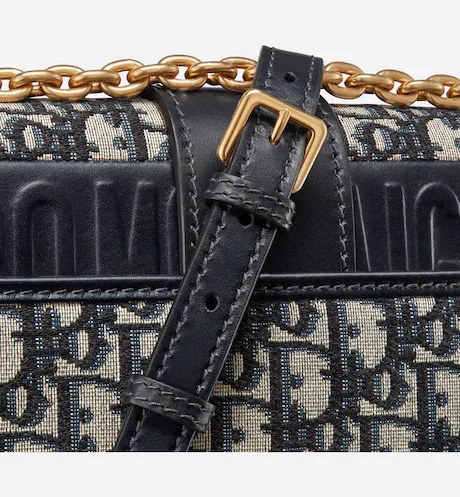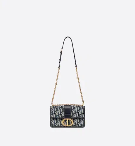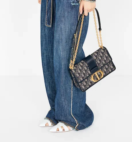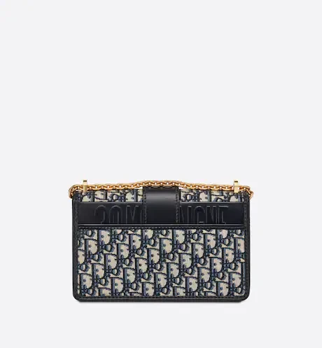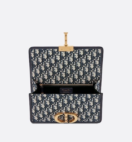 The 30 Montaigne line, inspired by the hallmark address, offers essential pieces that embody the House's iconic codes. The handbag is crafted in blue jacquard and highlights the House's iconic Dior Oblique motif for an elegant and modern design. The flap has an antique gold-finish metal 'CD' clasp, inspired by the seal of a Christian Dior perfume bottle. Other details, like the embossed '30 MONTAIGNE' signature at the back highlight the streamlined design. The bag features a chain that allows it to be carried by hand, worn over the shoulder or crossbody.