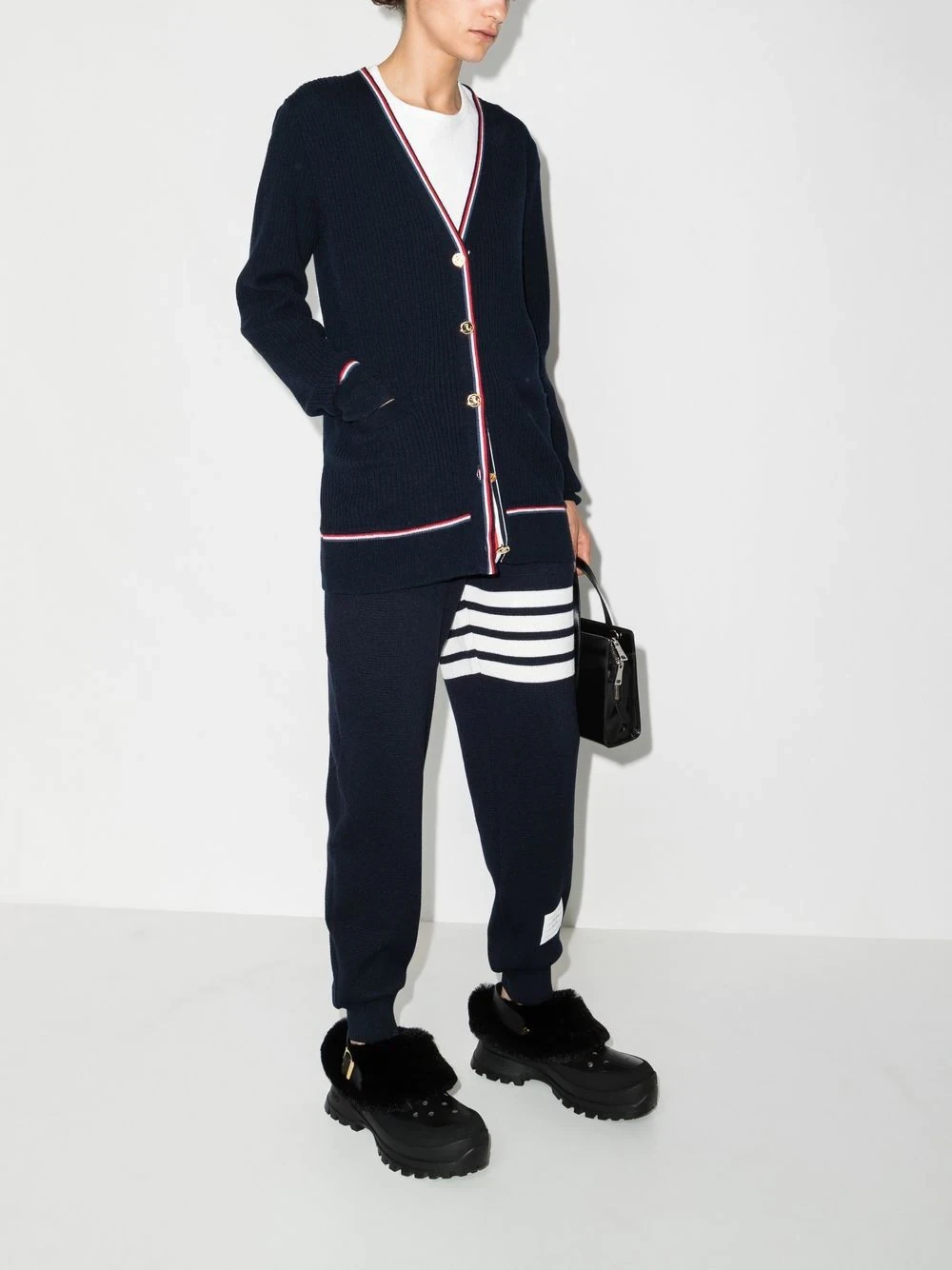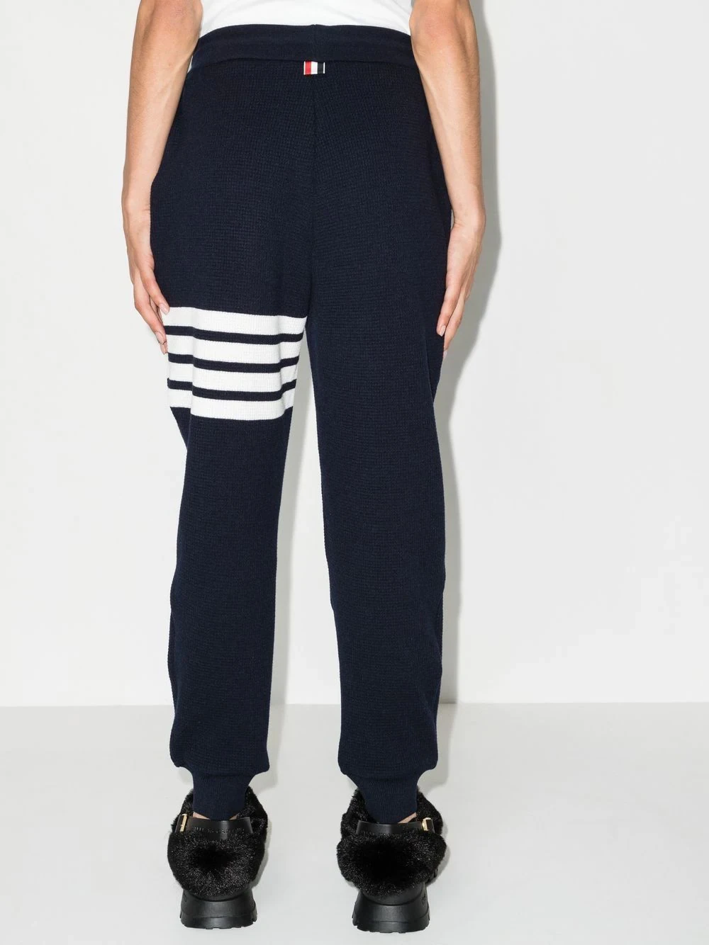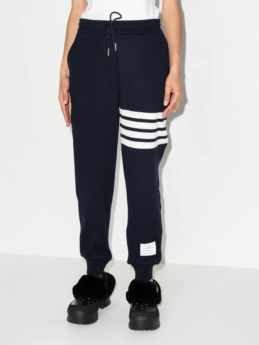 4-Bar drawstring track pants from THOM BROWNE featuring navy blue, wool-cashmere blend, signature 4-Bar stripe, signature grosgrain loop tab, logo patch to the front, elasticated drawstring waistband, two side slit pockets and ribbed cuffs.