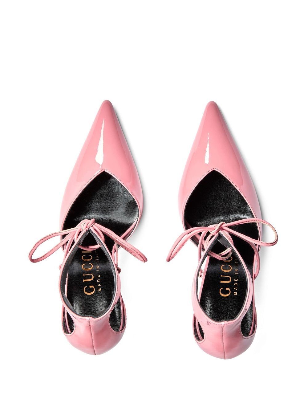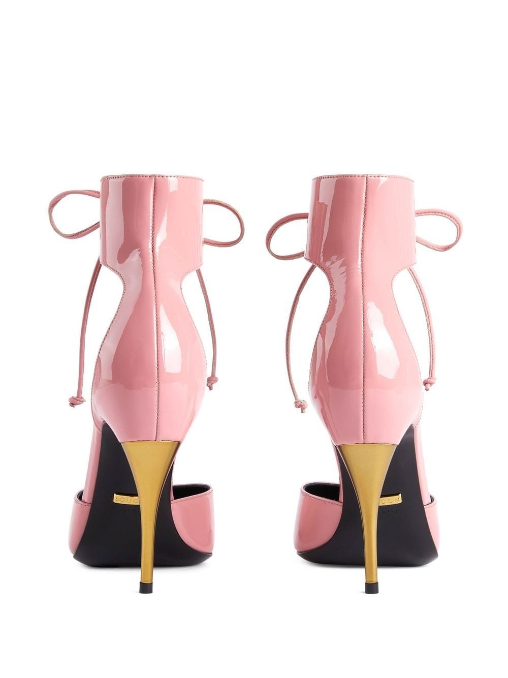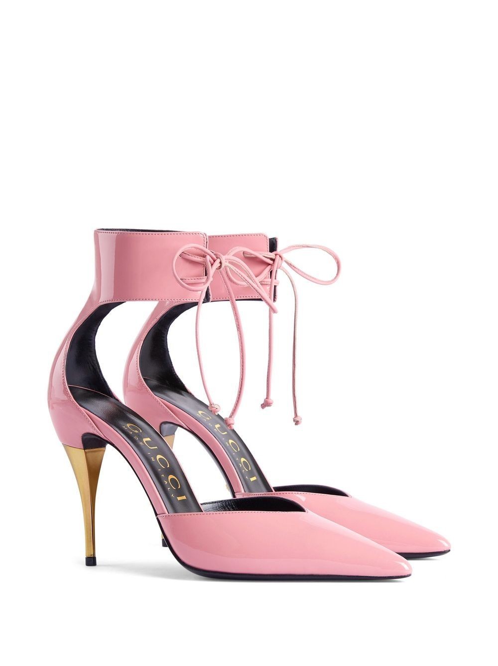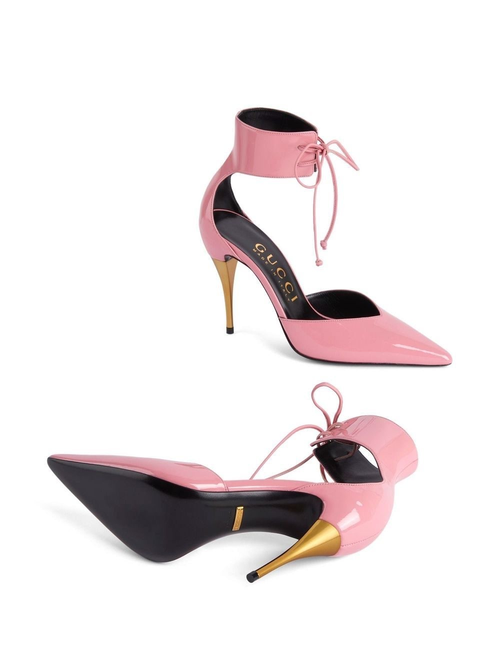 This SS23 Gucci reinvents some of the brand's historic classics by delving into the Italian House's past. These pointed pumps are made of glossy patent pink leather, inspired by styles from the houses archives. This pair has a classic charm thanks to the front tie-fastening, pointed toe and contrast high heel.