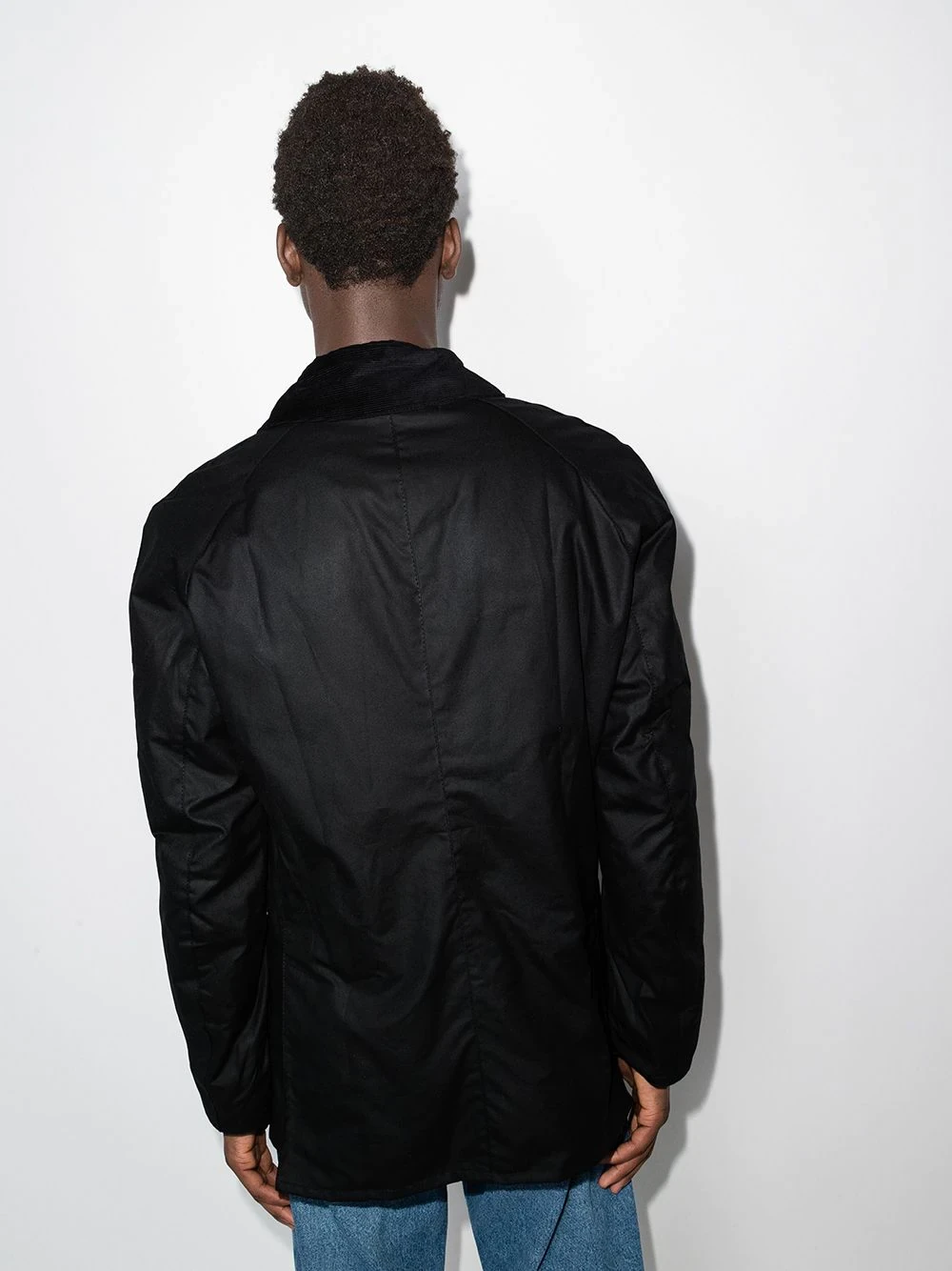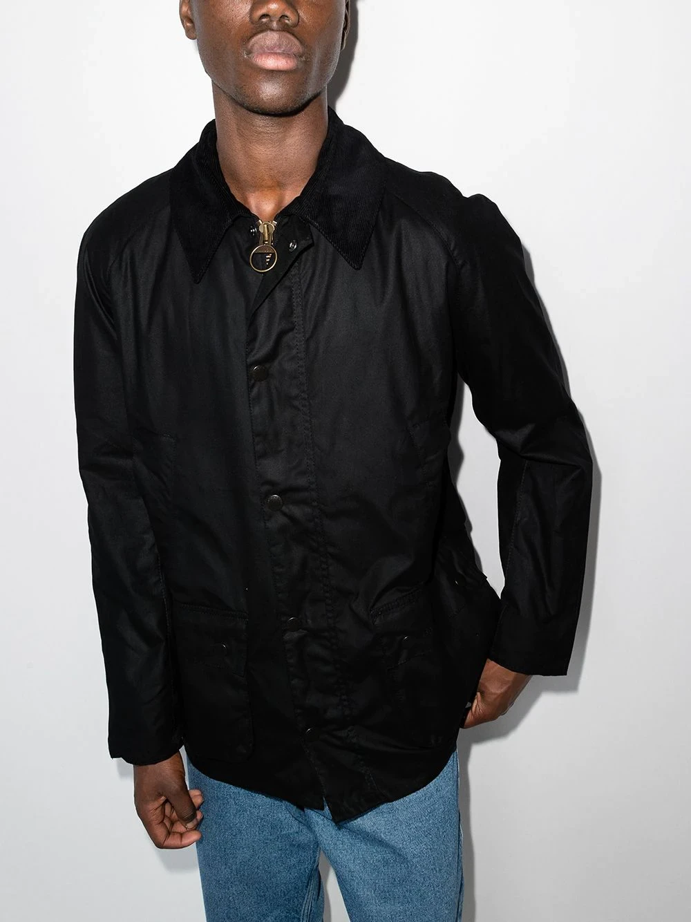 Black cotton Ashby wax jacket from Barbour featuring contrasting collar, snap-button fastening, two side patch pockets, long sleeves, English rear vents and long raglan sleeves.