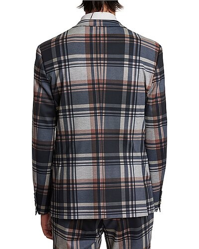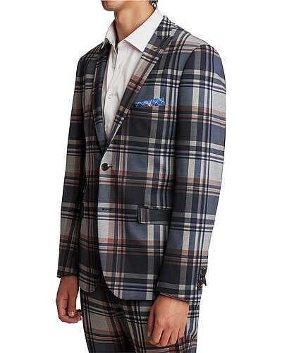 Ashton Slim Peak Jacket in navy grey plaid with slim fitting, peak lapel, side vents, two button jacket