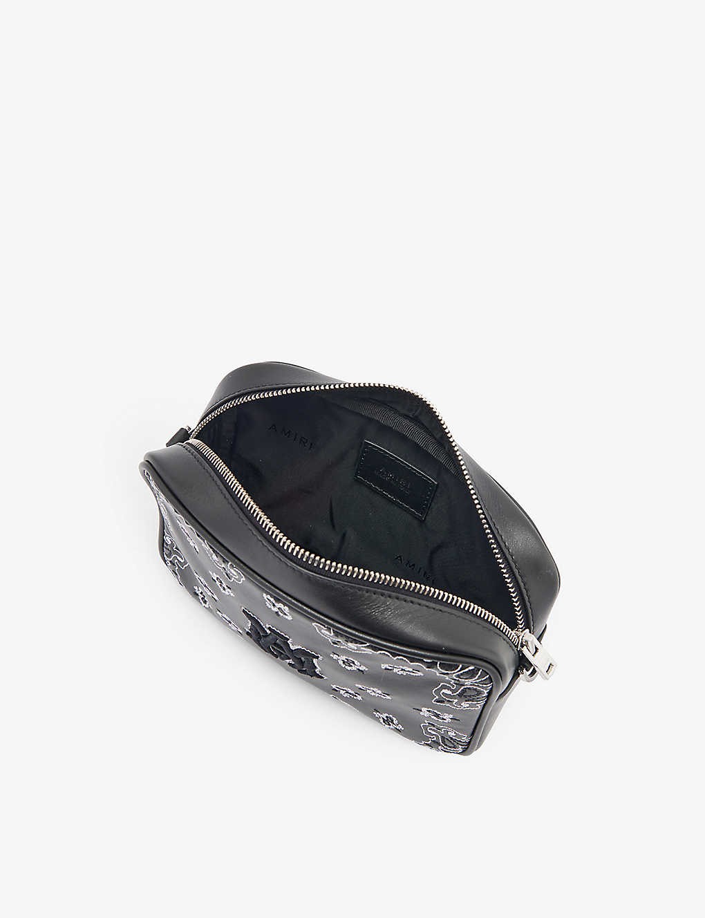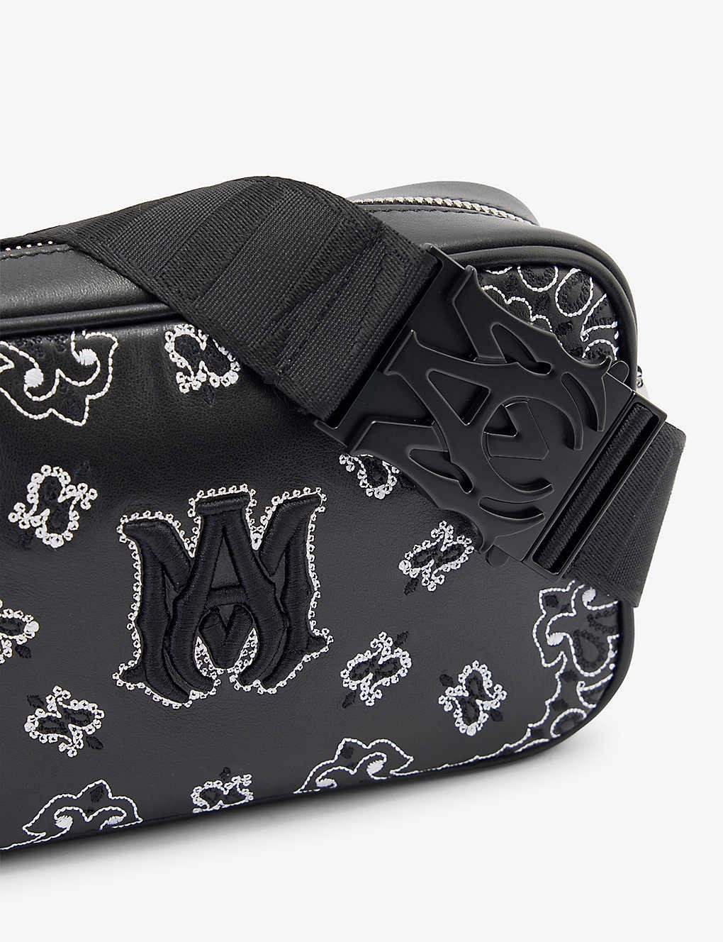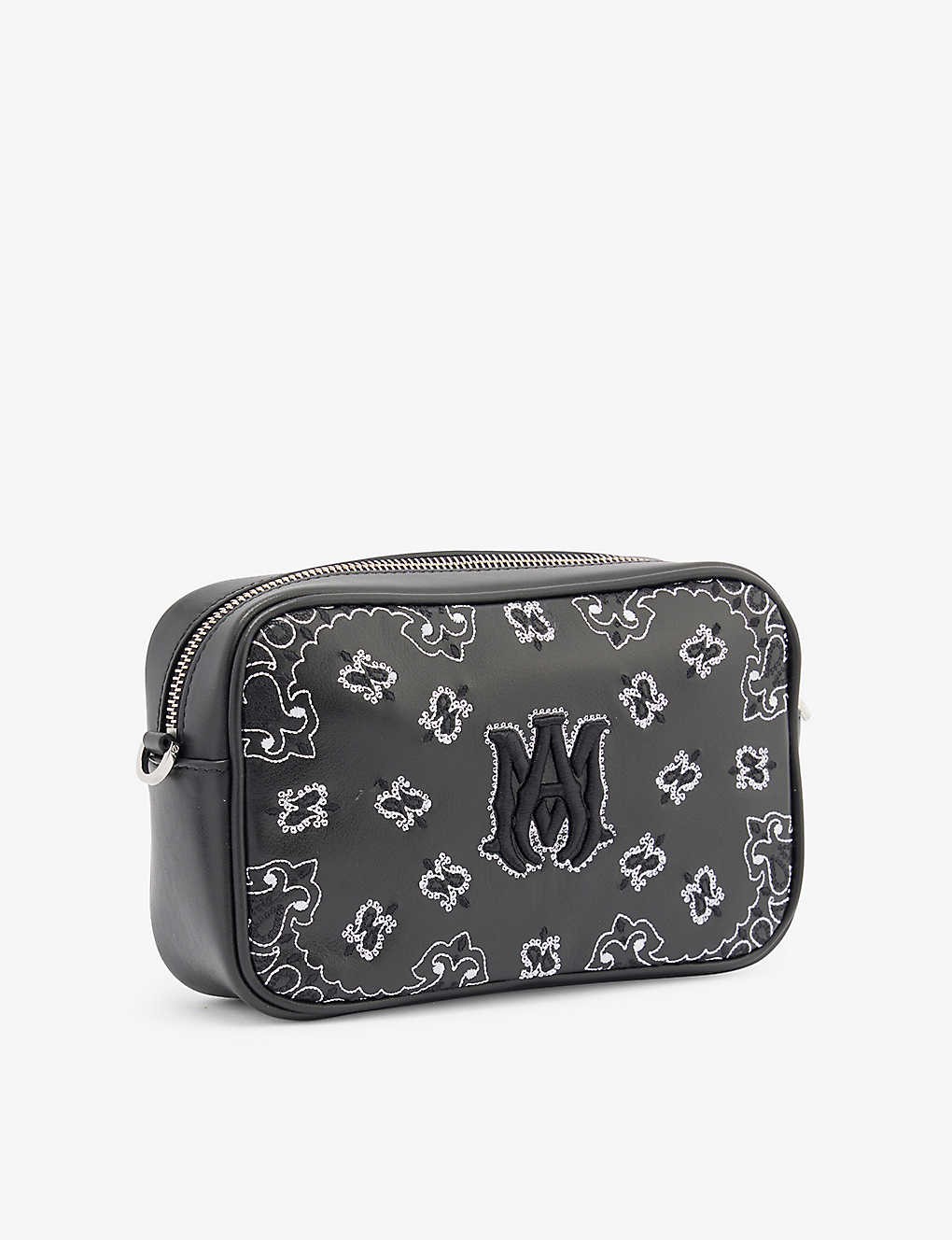 Rectangular shape, detachable adjustable branded strap, embossed brand embroidery at front and back, all over embroidery, all over smooth leather, silver-toned hardware, one main compartment, internal brand patch, fully lined