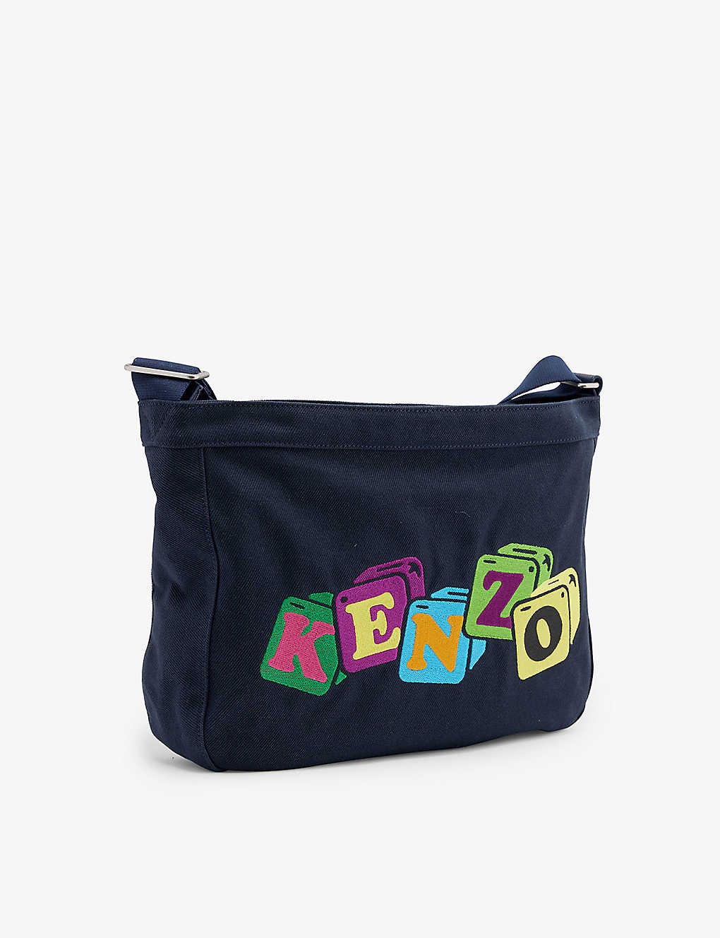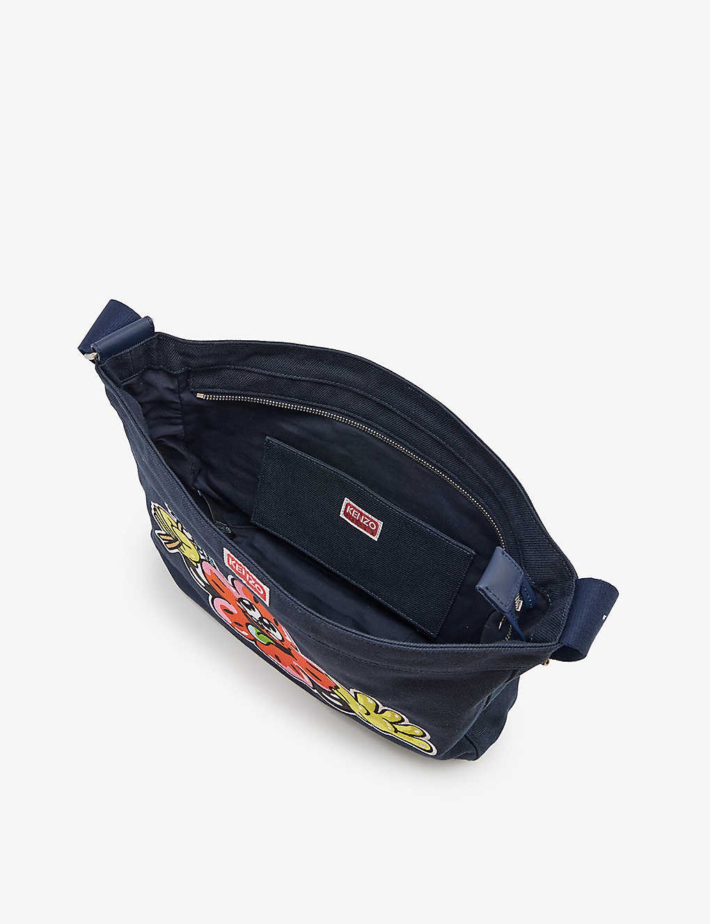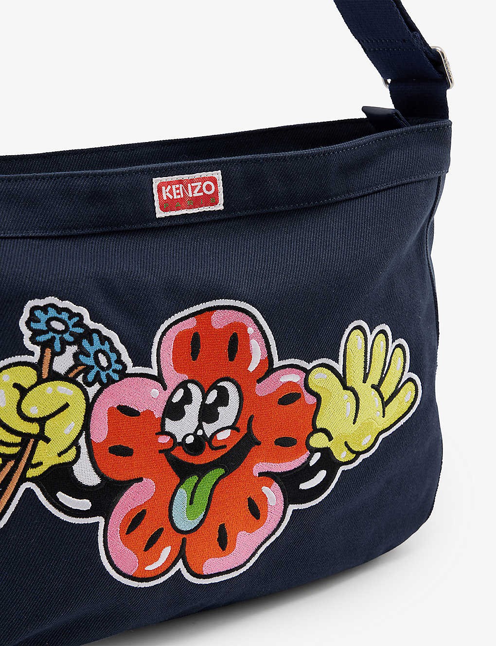 Rectangle shape, branded patch at front, graphic embroidery at front, branded text embroidery at back, silver-toned hardware, one main compartment, slip pocket at interior