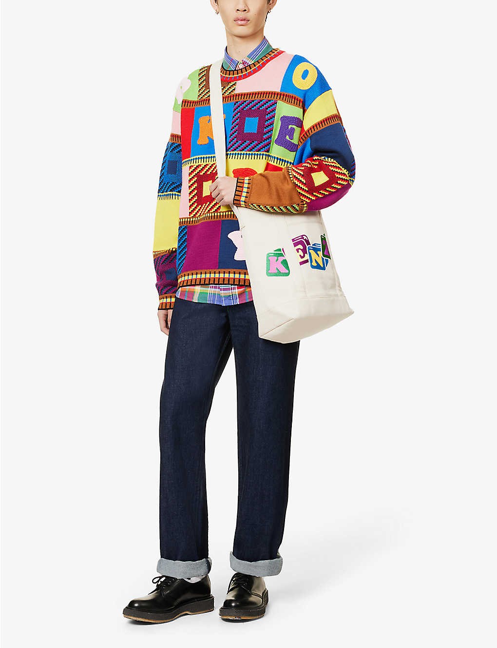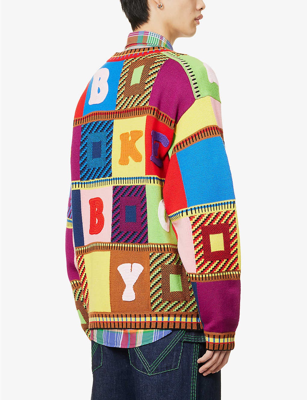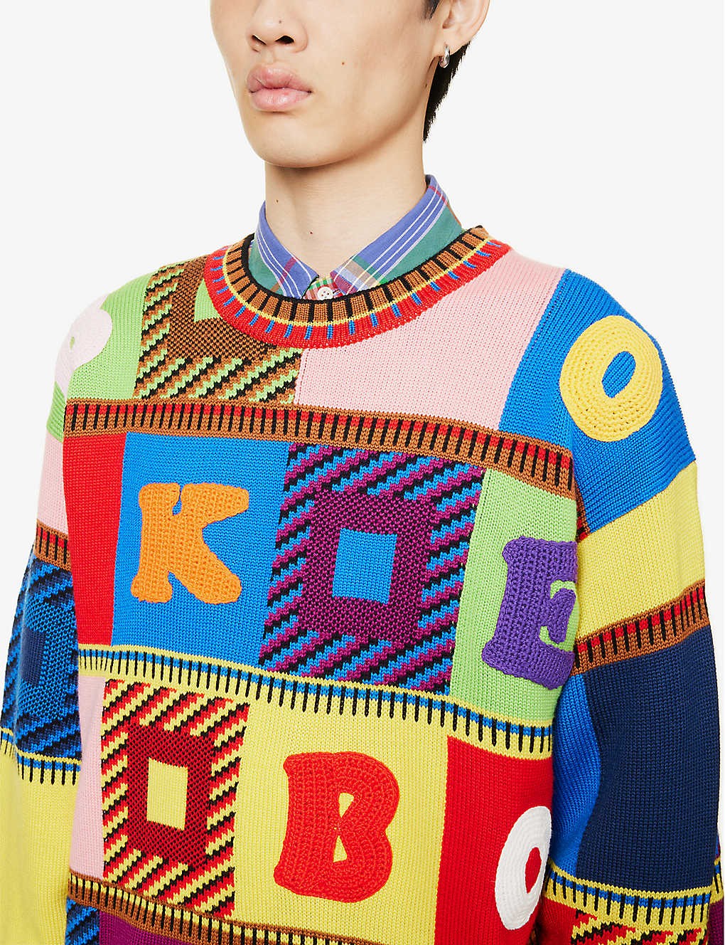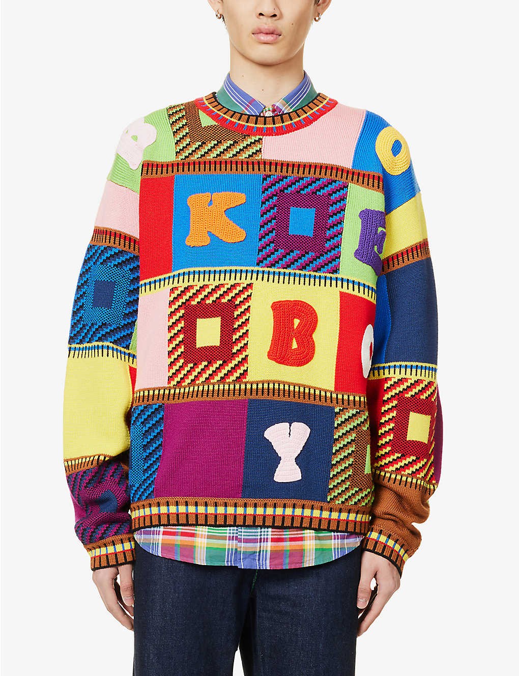 Relaxed fit, crewneck, dropped shoulders, long sleeves, medium knit, all-over contrast patchwork pattern and crochet letters, ribbed trims