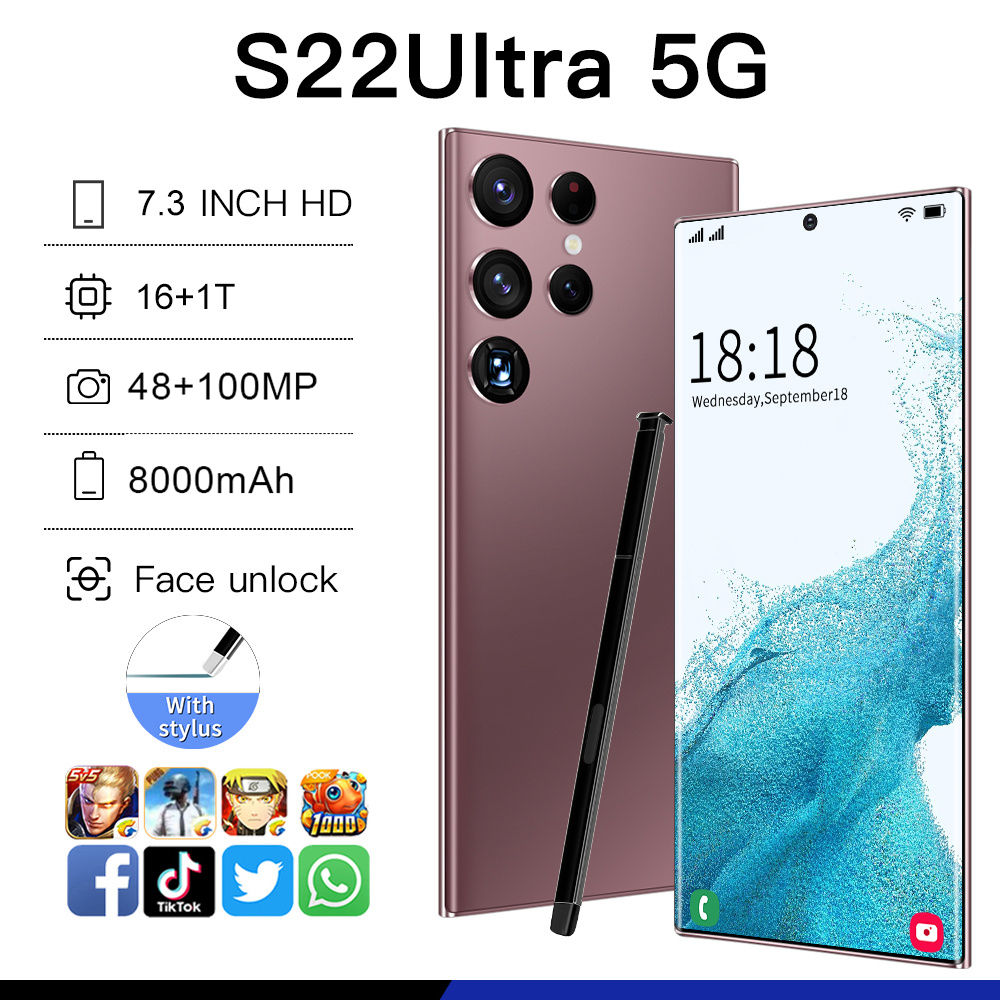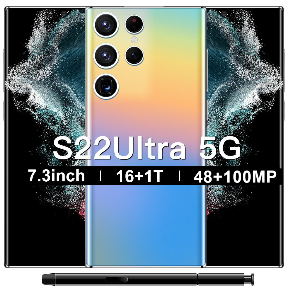 Essential details Brand Name: UOP CPU: Dual Core Screen: >7" Processor Brand: MTK 67XX series Front Camera: 24.0MP Rear Camera: 48 MP, 64MP Screen Resolution: 3040x1440 Cellular: GSM, WCDMA, LTE, 5G, CDMA, CDMA2000, TD-SCDMA Display Type: OLED Operation System: Android 12 Feature: Waterproof, Dual SIM Card, Qwerty Keyboard, Gaming, Beauty Camera, Gesture control, WIRELESS CHARGE, Quick Charge, Shockproof, Face Recognition, SDK available Quick charge: 20-29W Display refresh rate: 120Hz Battery Capacity: 7000-7999mAh Mobile phone type: Smart phone System: Android 12 ROM: 1TB Camera: 24MP 48MP Battery: 8000mAh Language: Multi-language Support Network: 2G/3G/4G/5GWIFI Network Phone Name: S22 ultra Screen Size: 7.3inch