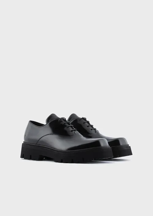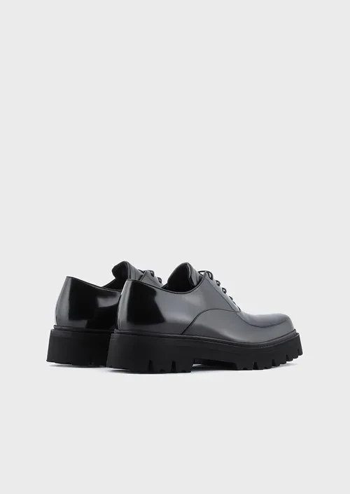 The lug soles on this footwear give it a strong, striking appearance. Brushed calfskin lace-ups featuring a square toe and logo footbed that makes them even more comfortable. These Derby shoes are made from polished, abraded calfskin with a high-frequency crafted eagle on the tongue. The sole is made of EVA with a rubber welt for maximum lightness. Made in Italy.