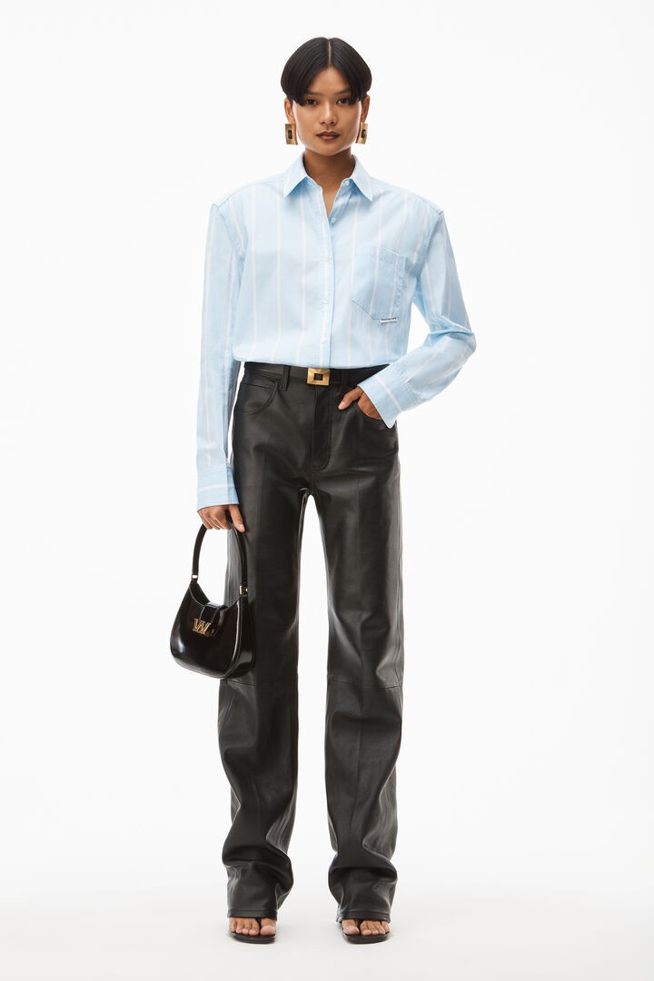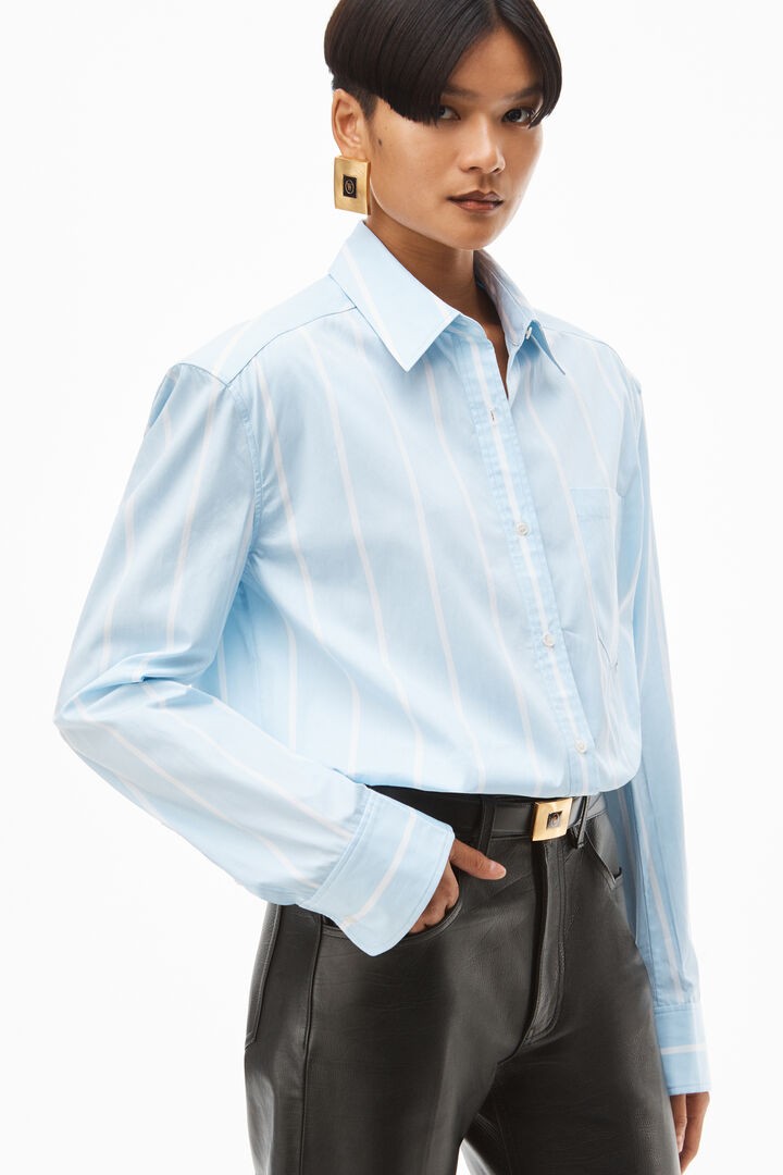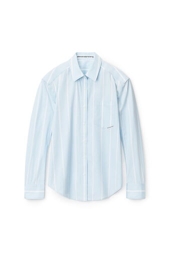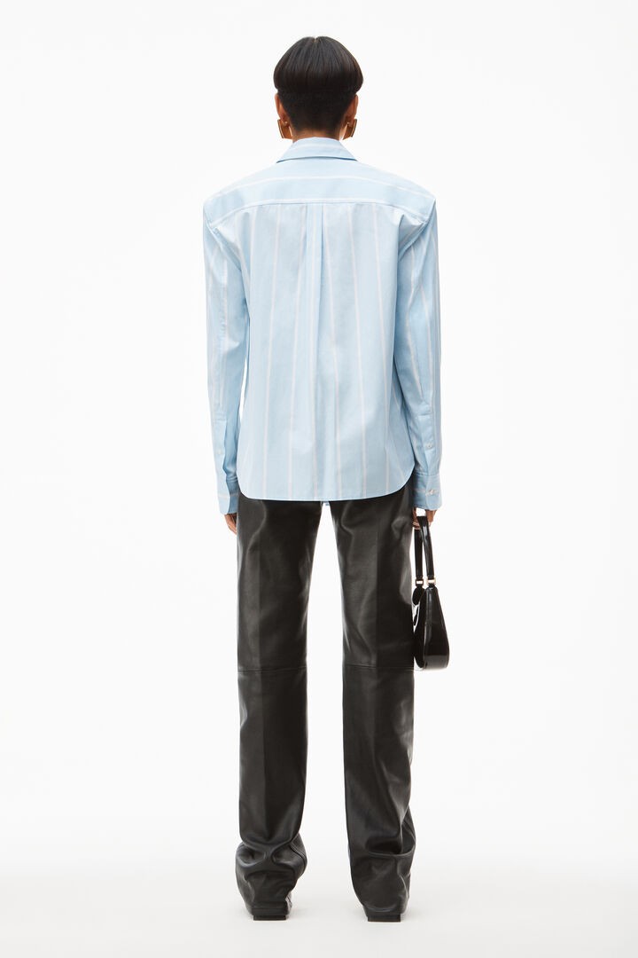 oversized button down with classic menswear stripes, defined shoulders, and elongated sleeves in oxford blue/white fine stripe shirting