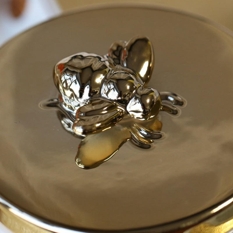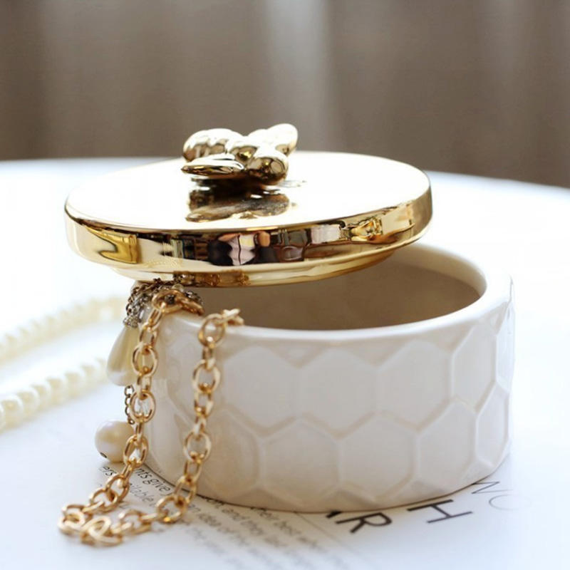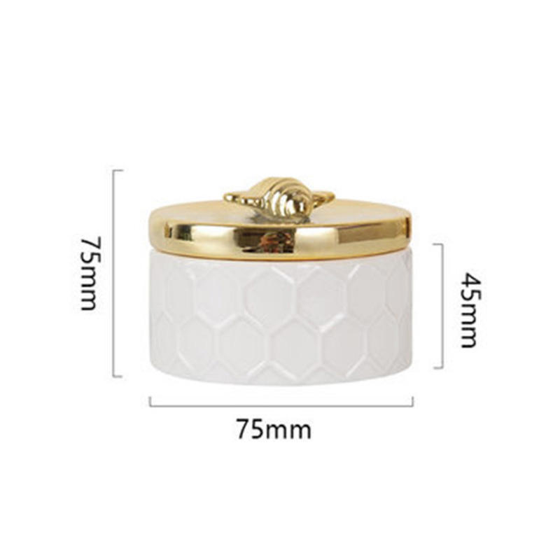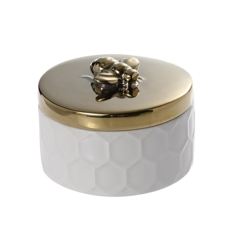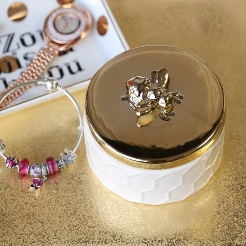 Essential details Type: Other Home Decor Place of Origin: Guangdong, China Material: Ceramic Product name: Ceramic Gold Plated Bee Jewelry Box Color: Customized Color Usage: Hotel Home Size: Customized Size Function: Home Accessories MOQ: 10pcs Logo: Customized Logo Acceptable Style: ceramics Keyword: Hand Made Necklace Round Container Storage