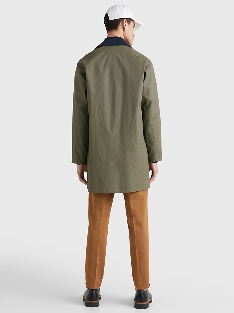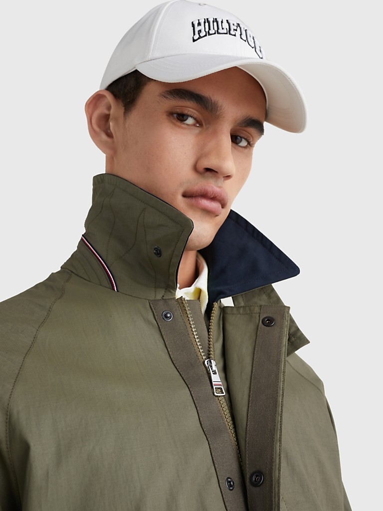 Tommy Hilfiger men's jacket. Our latest tech jacket is made from coated linen that repels water while allowing for maximum breathability. There are so many things we love about this one–generous pockets, the bold colorblock lining, and an easy cut that makes layering a breeze.