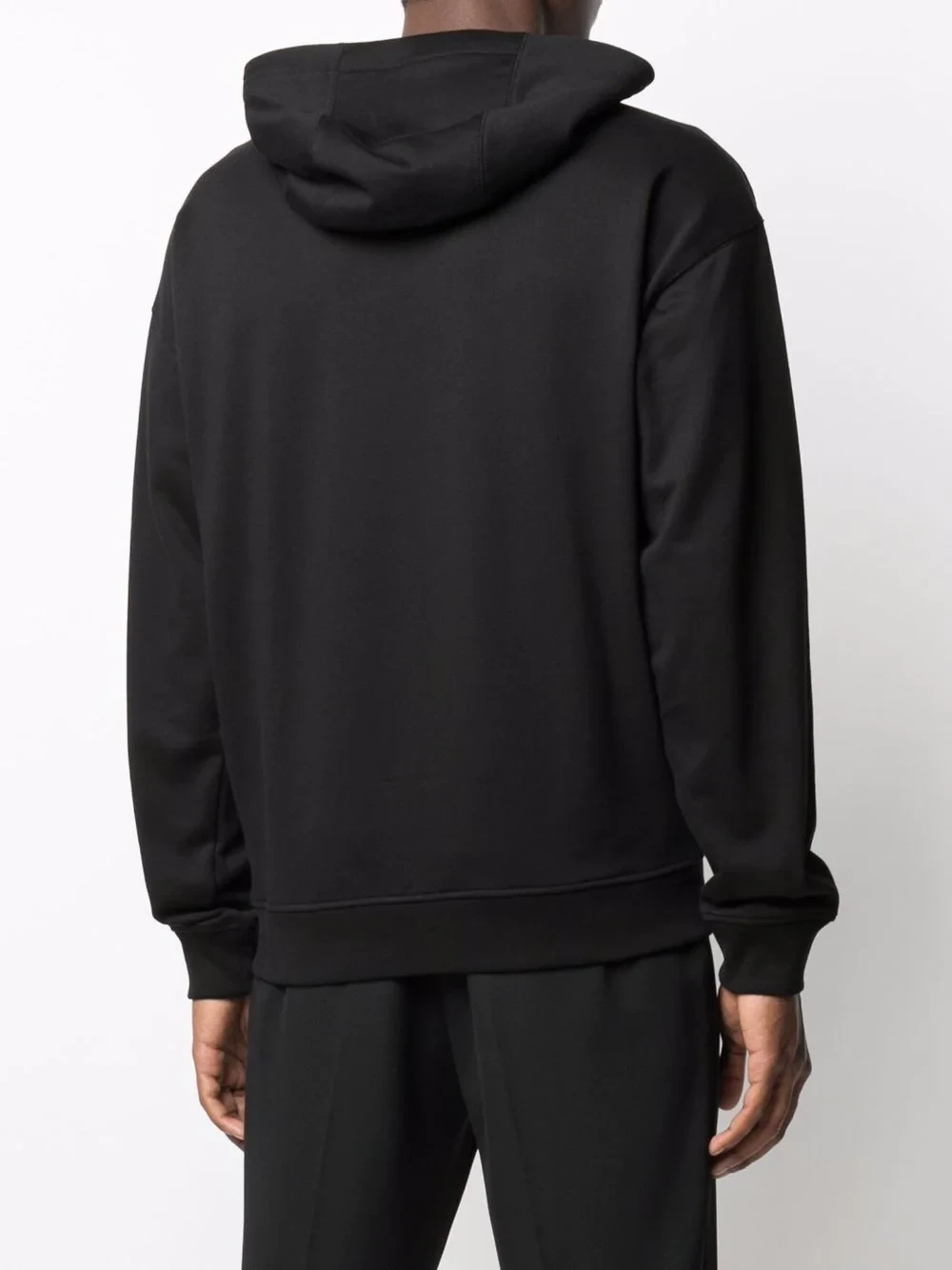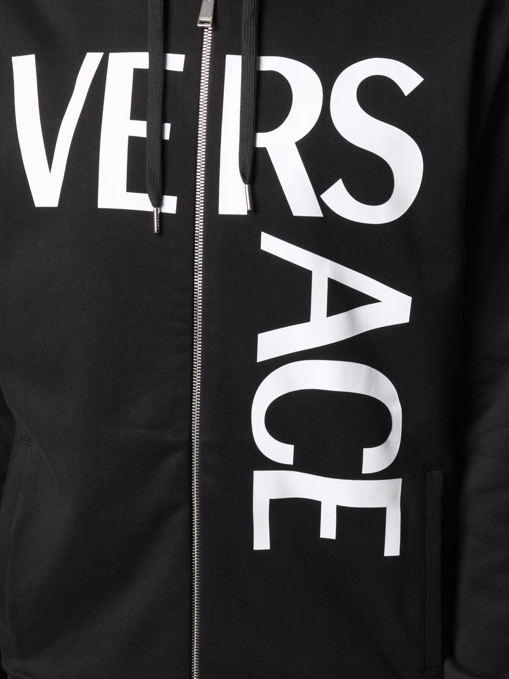 Emblazoned with bold logo lettering, this black and white Versace hoodie has a zip through the front and two side slit pockets.