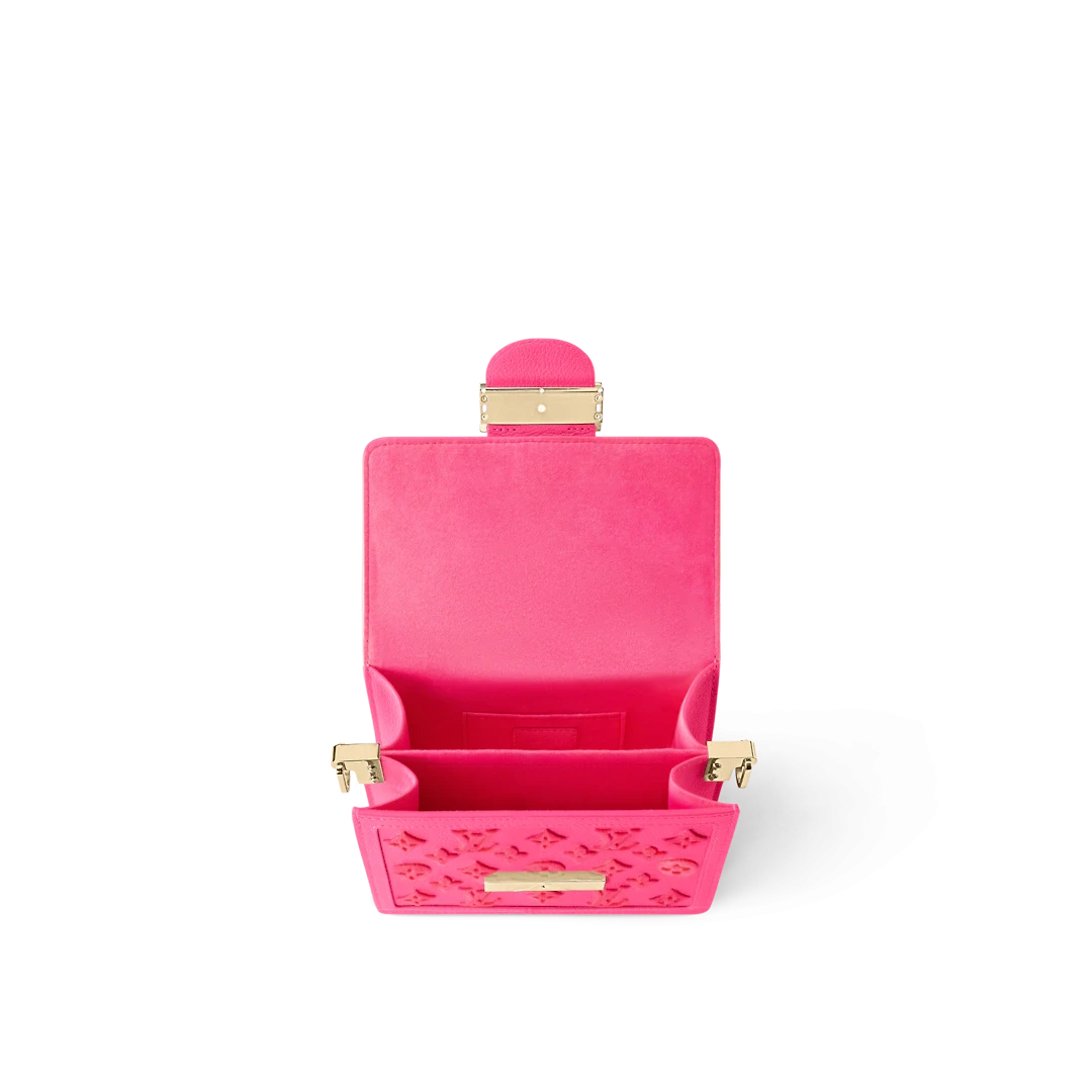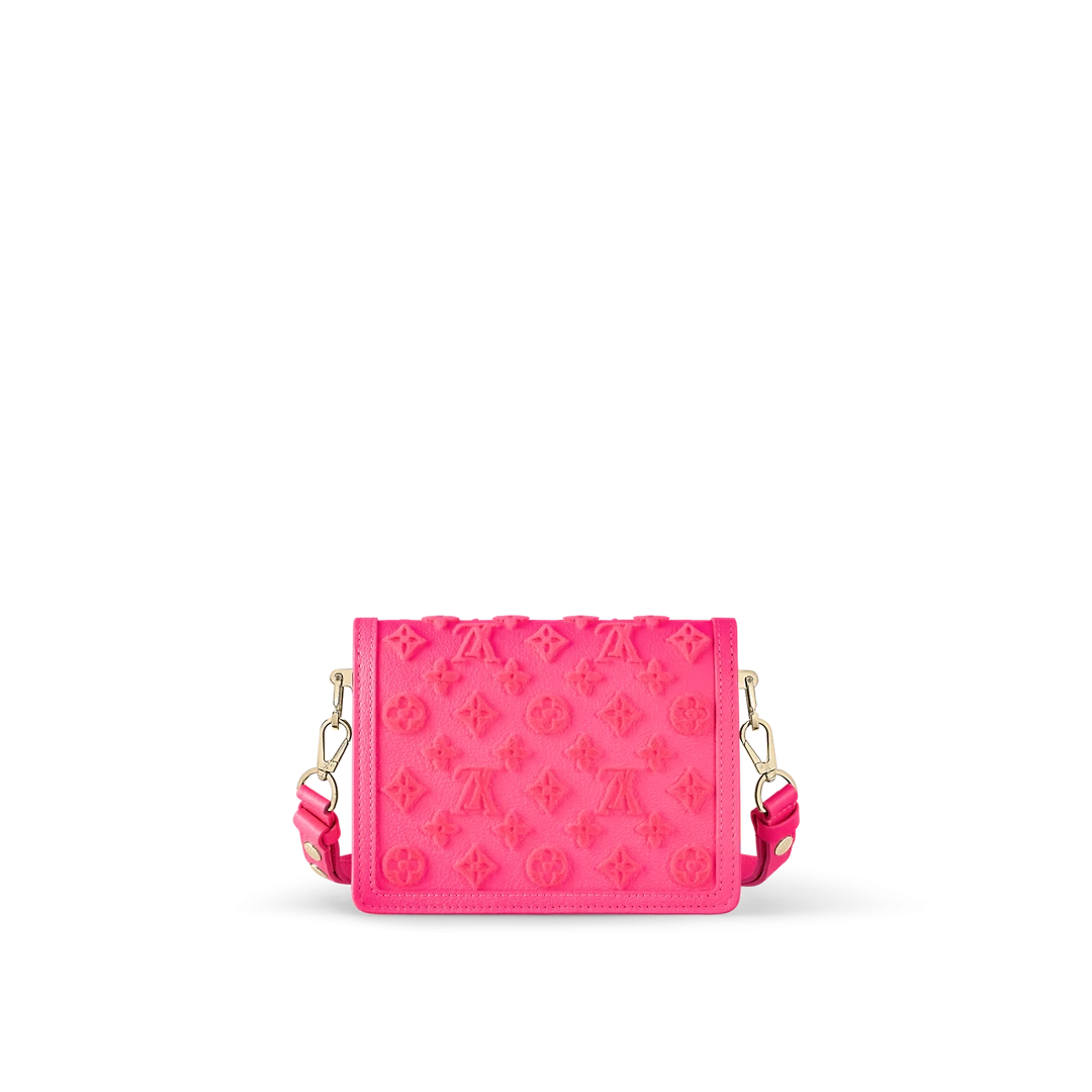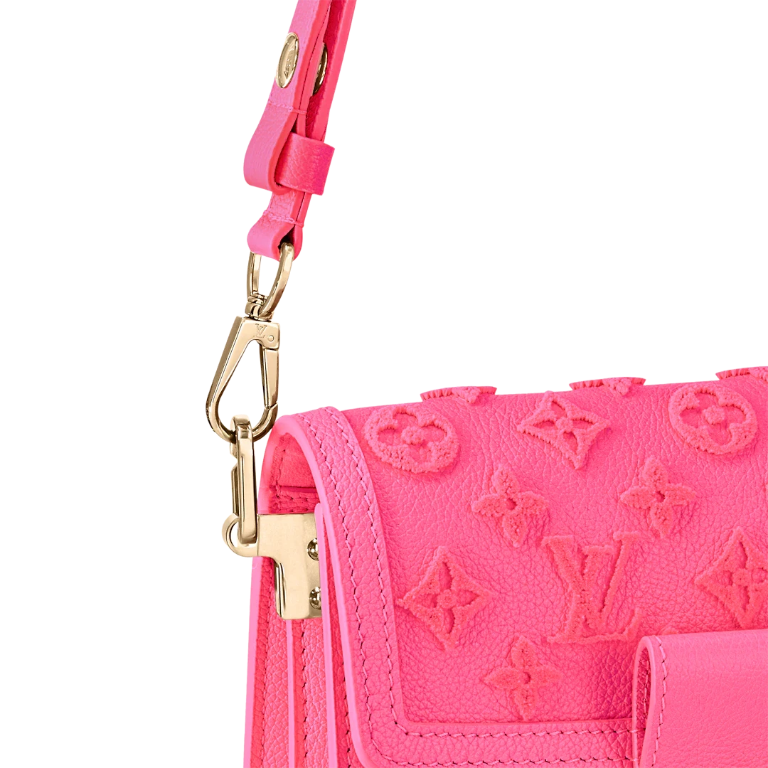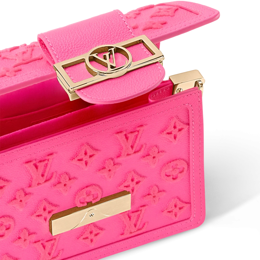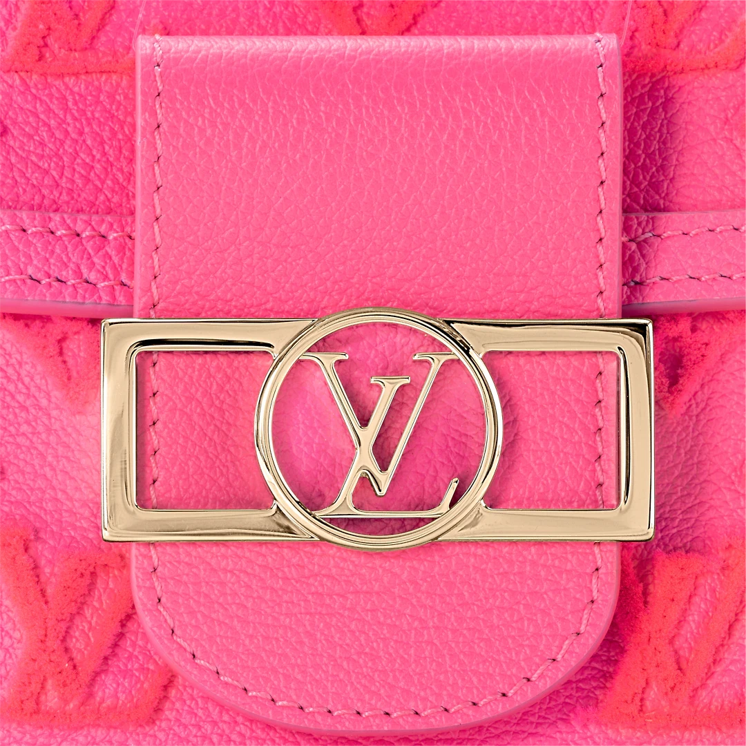 Part of the LV Rose Fluo capsule collection, this Dauphine Mini bag in bright pink calfskin fuses an audacious colourway with a soft feel, thanks to the tufted Monogram motif embroidered into the leather. Velvety to the touch, the leather tufting illustrates the House’s superior leather craftsmanship and gives the bag a modern look.