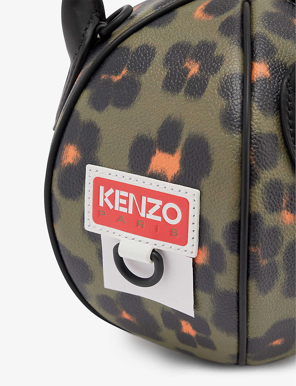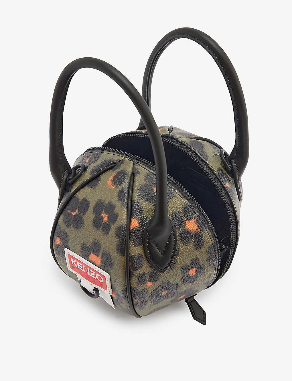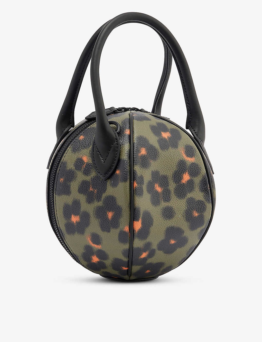 Spherical shape, detachable twin carry handles, detachable adjustable strap, branded patch at front, all-over graphic print and tumble-grain texture, one main compartment, fully lined
