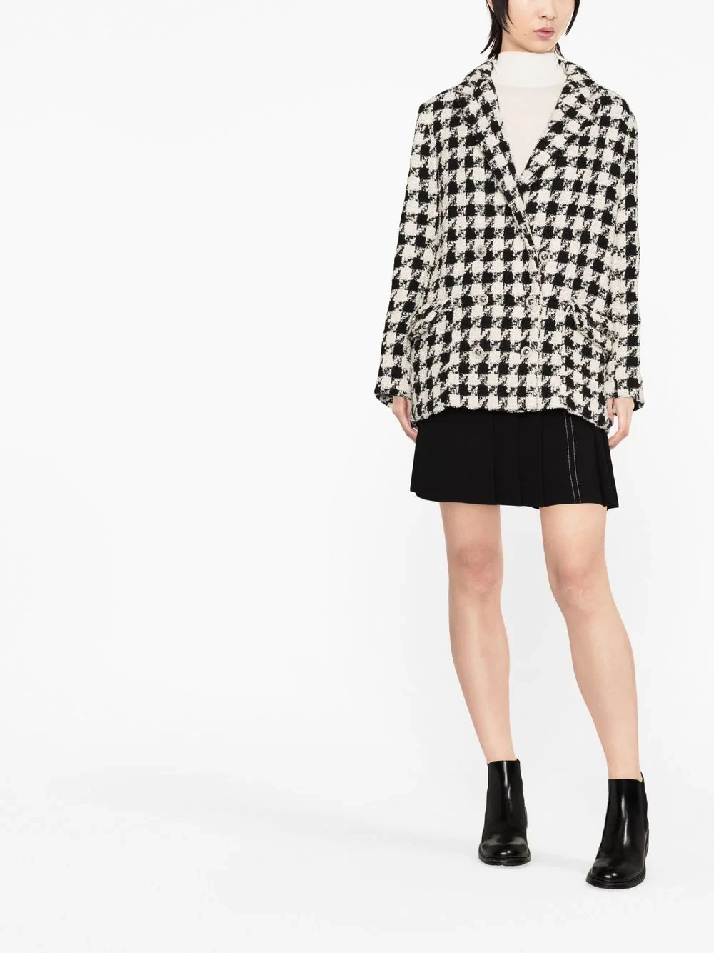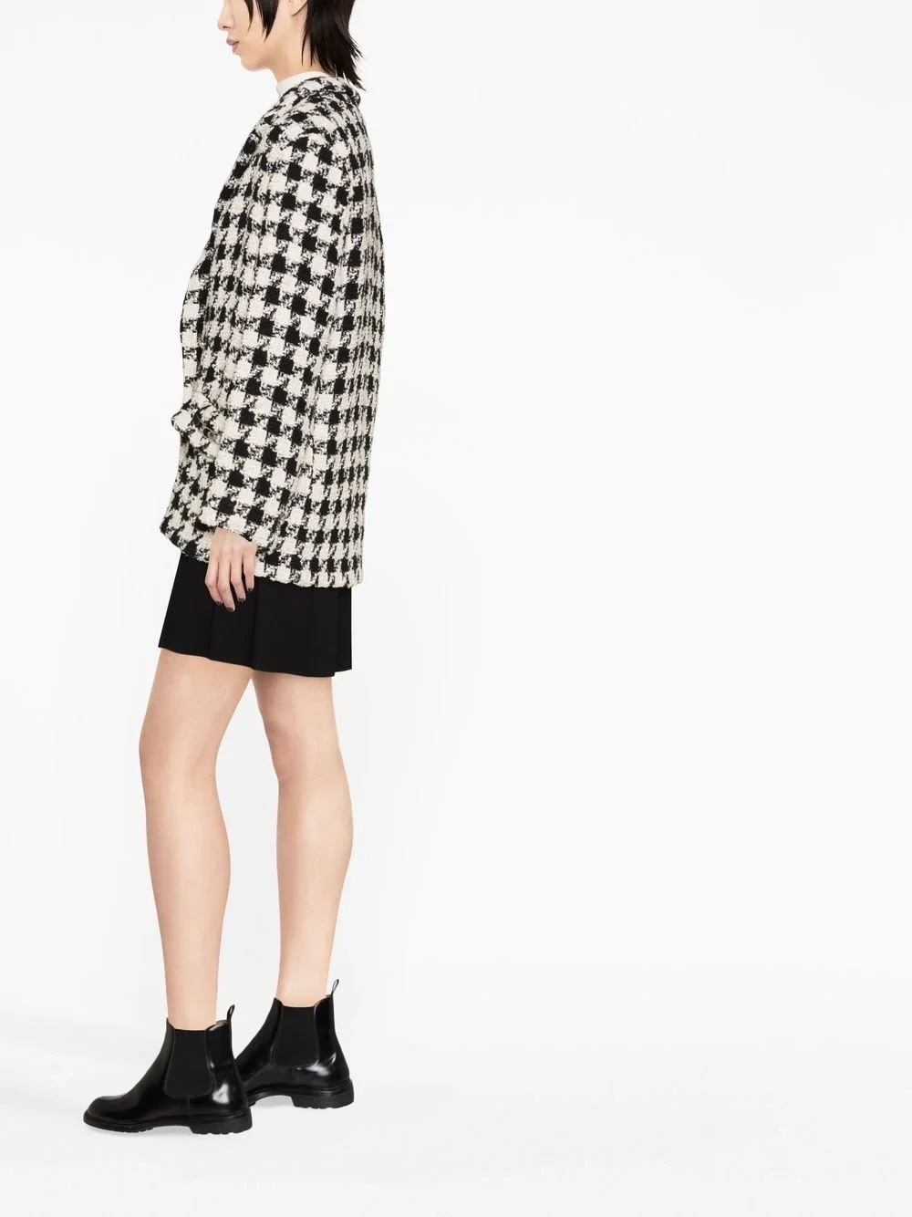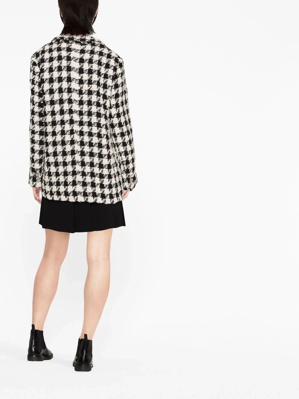 A wardrobe staple, this blazer features subtle updates, courtesy of Maje. A recognisable black and white houndstooth pattern decorates the double-breasted design, while the fastening sits nearer the hem alongside slanted flap pockets.