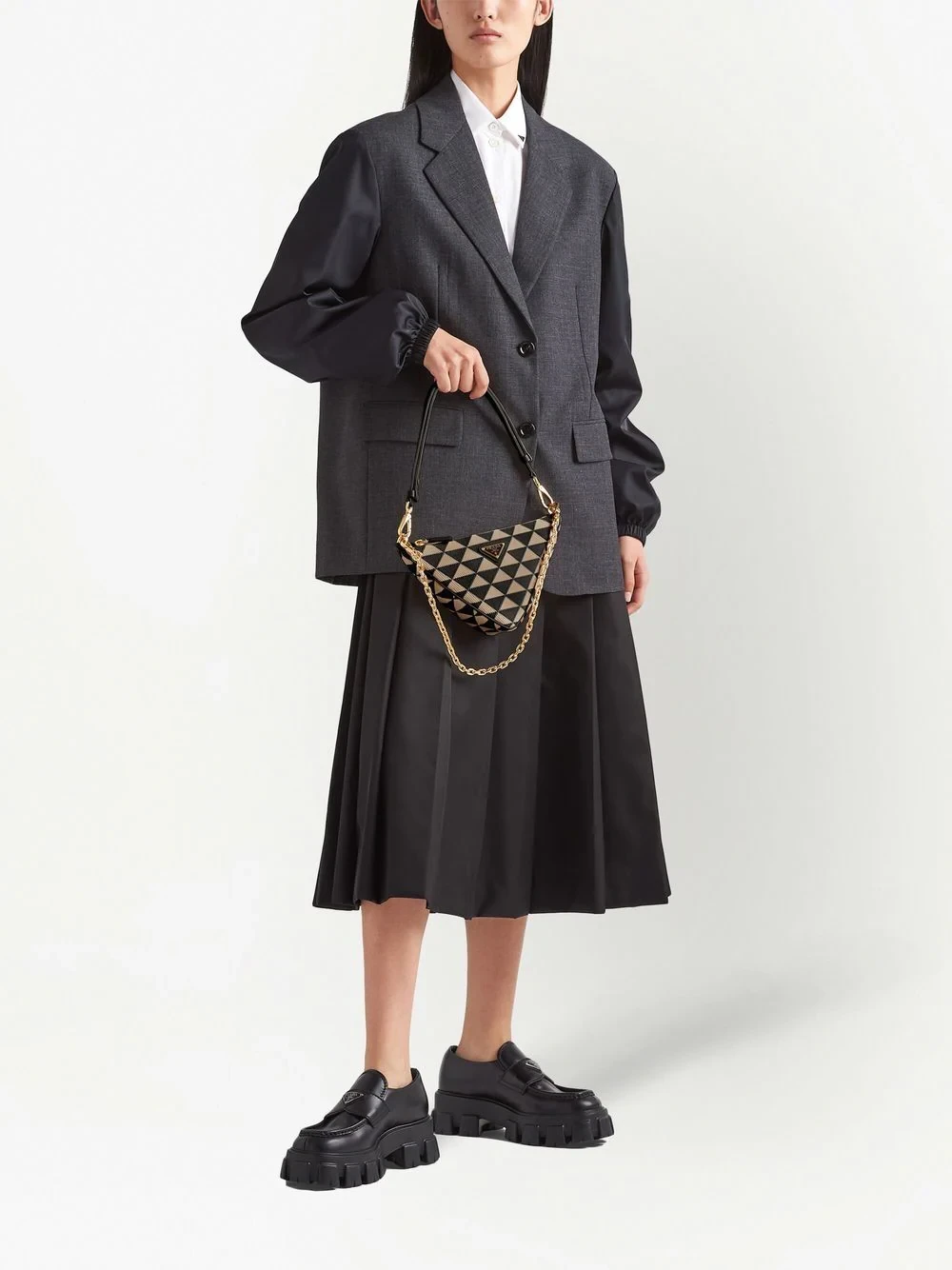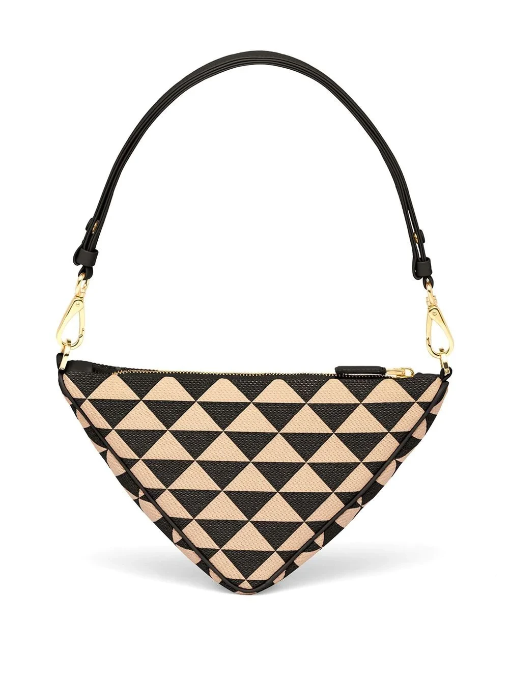 This mini bag is defined by its triangular silhouette, reminiscent of Prada's celebrated geometric shape. Meanwhile, the enamel triangle logo arrives at the front of the design, offering a contrasting textural element.