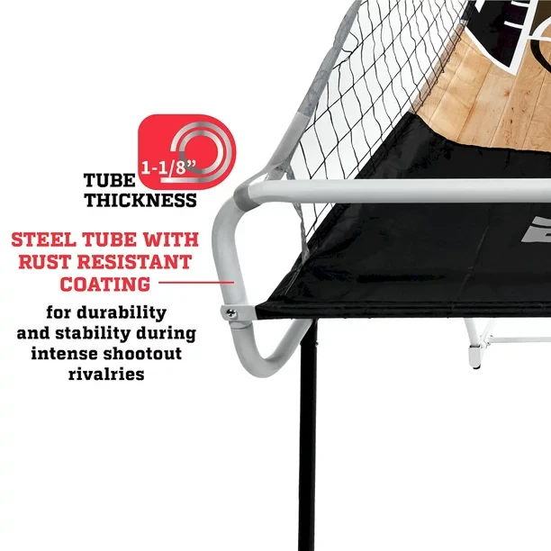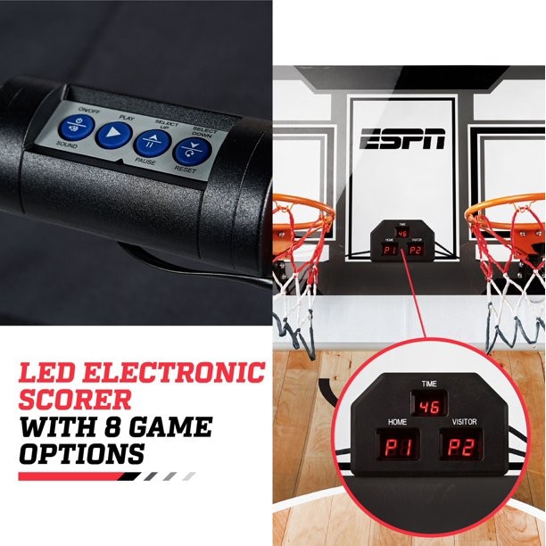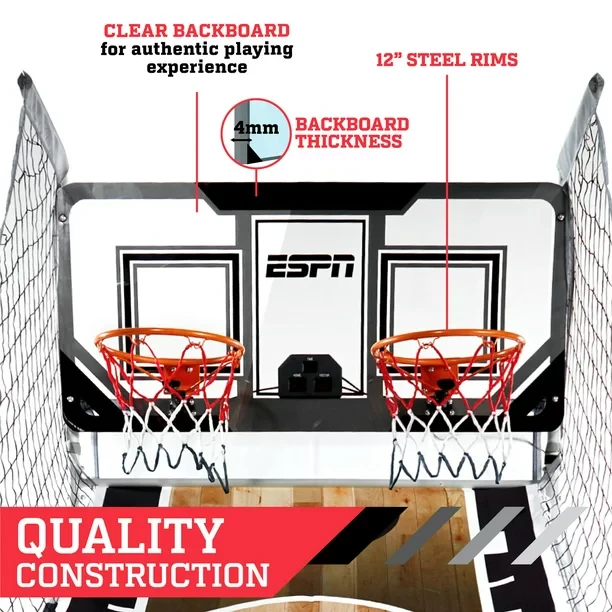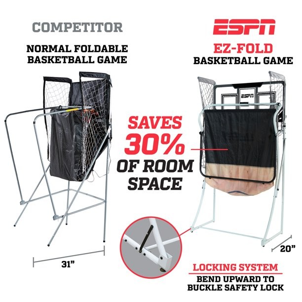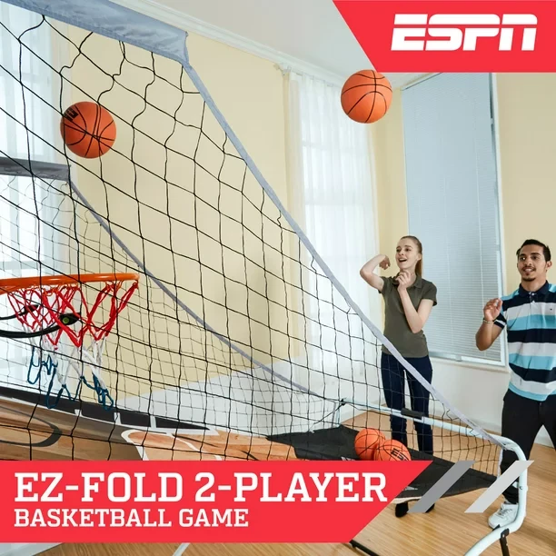 The ESPN 81 inch 2-Player Foldable Arcade Basketball Game brings head-to-head competition indoors for hours for fun and excitement. This game comes complete with everything you need for quick assembly and play. This ESPN basketball game has a more compact storage design than other indoor basketball games. The backboard is a clear polycarbonate design giving an authentic playing experience. The frame is a steel tube with two reinforced steel rims adding durability during intense shootout rivalries. Dont miss out on the ESPN 81 inch 2-Player Foldable Arcade Basketball Game; it is built to last and will impress your friends and family.