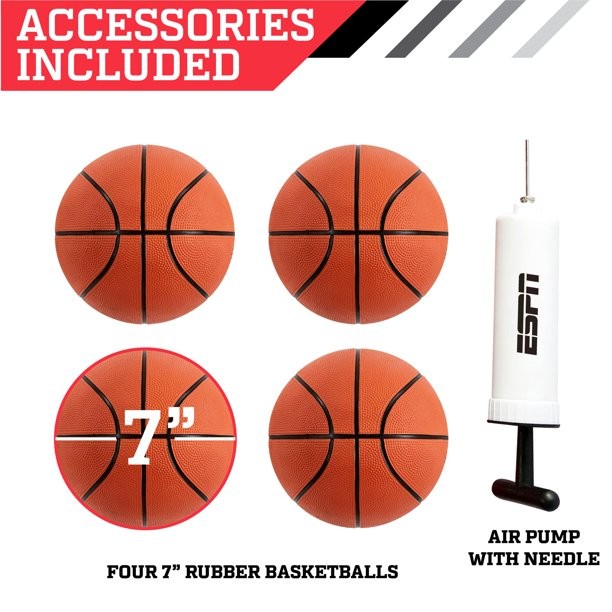 LED electronic scoring with realistic arcade sound effects, four basketballs and air pump