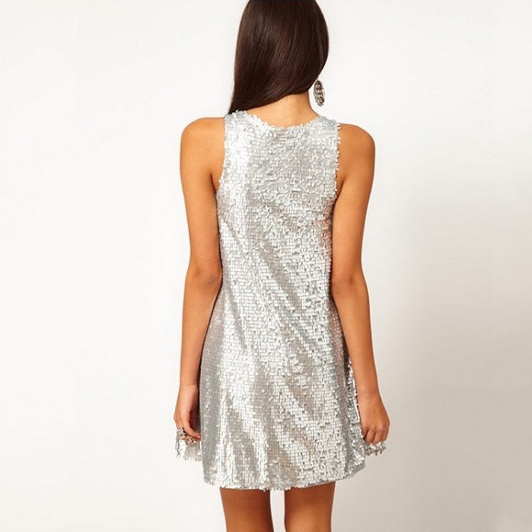 European and American style silver sweet spring and summer sparkling sequins wrapped sleeveless dress with large swing vest skirt