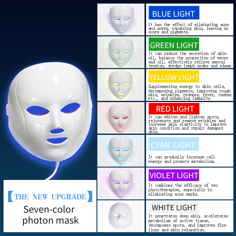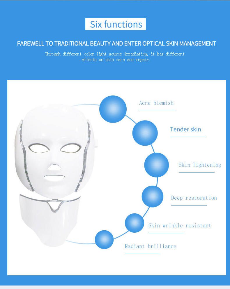 Essential details Place of Origin: Guangdong, China Model Number: Y-1201Z Type: HAND HELD Feature: Pigment Removal, Pigmentation Correctors, Skin Tightening, Acne Treatment, Skin Rejuvenation, Dark Circles, Wrinkle Remover, Pore Shrinking, Detox, Firming, Moisturizer Material: ABS, Plastic Plugs Type: Other Waterproof: Yes Target Area: Eyes, Face Warranty: 1 Year Product Name: Led Facial Mask Color of LED Light: 7 Colors(Red/Green/Blue/Yellow/Purple/Cyan/White) Red Light: Improve Cell Activity Green Light: Reduce Skin Oil Secretion Blue Light: Inhibit the Inflammation