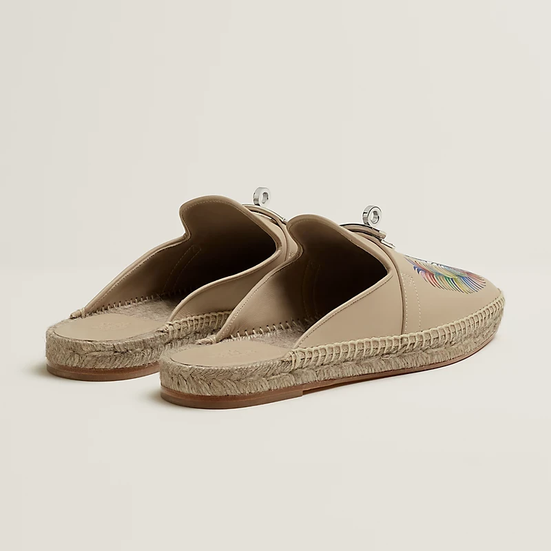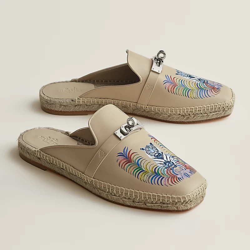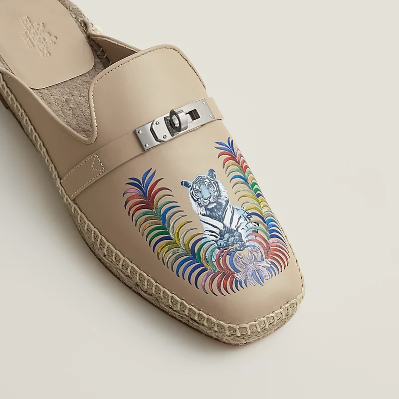 Espadrille in calfskin with "Tigre Royal" print, palladium-plated Kelly buckle and rope sole.