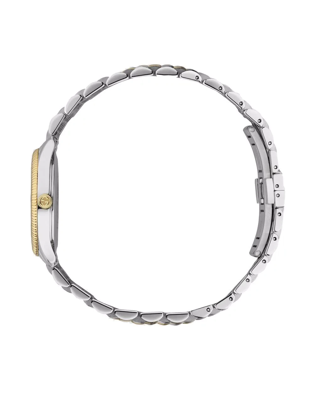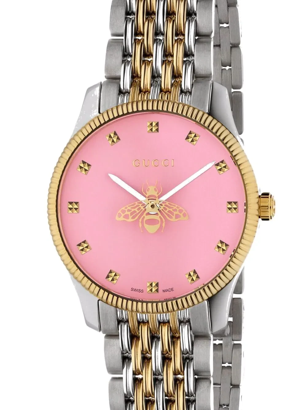Part of the G-Timeless collection, this classic 36mm timepiece is designed with a traditional sensibility, juxtaposed with codes inspired by Gucci's new aesthetic. House motifs are displayed on the dial, including the bee and the star.