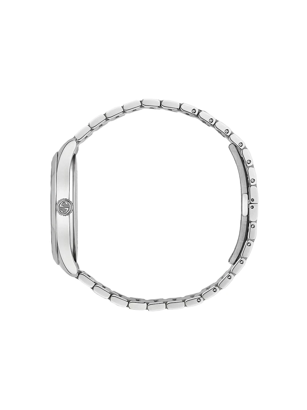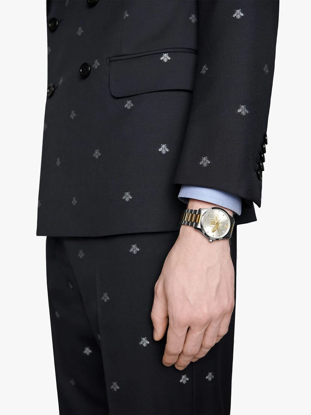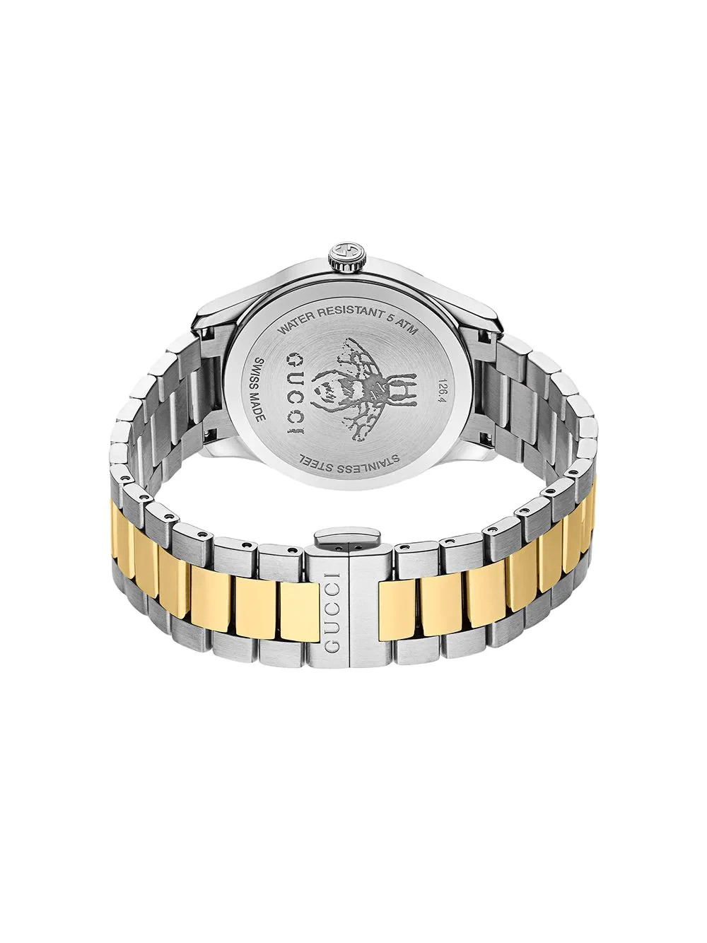 Part of the G-Timeless collection, this watch is designed with a mix of steel and yellow gold PVD. The silver sun-brushed dial features a gold-toned Gucci bee at the centre, surrounded by other codes of the House displayed as the watch's indexes, including the star and Interlocking G.;Steel case, silver sun-brushed dial with bee motif, steel and yellow gold PVD bracelet;ETA quartz movement;Water resistance: 5 ATM (160 feet/50 meters);YA1264131;Swiss Made and two year international warranty. This item is unisex.