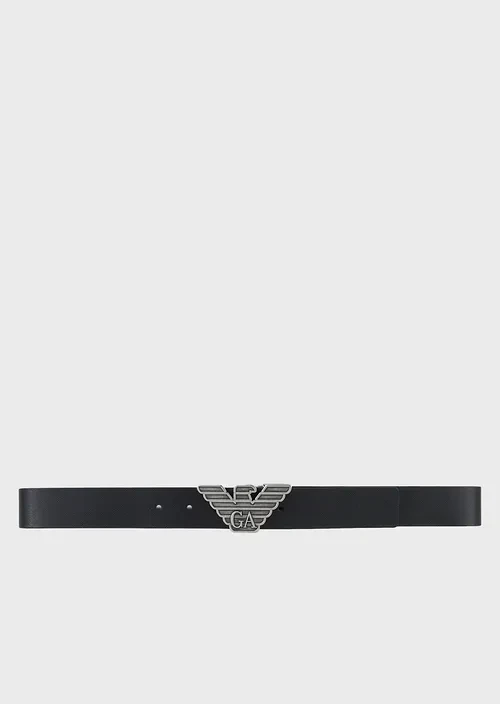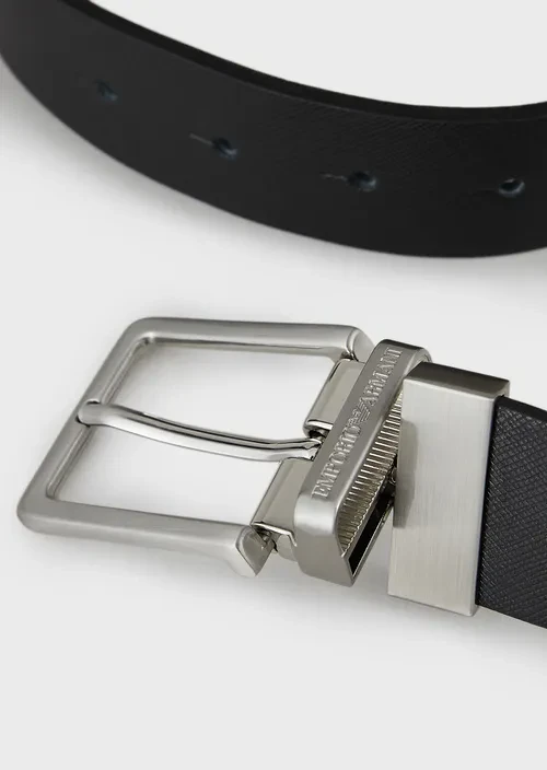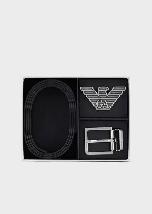 Emporio Armani style is also found in small leather goods, thanks to functional accessories that complement the refined, on-trend design. This gift box contains a reversible calfskin belt featuring a saffiano print on one side, along with a special interchangeable buckle — the iconic eagle one creates a statement look, while the simple metallic one provides a classic allure. Made in Italy. Dimensions: 125 x 3.5 cm