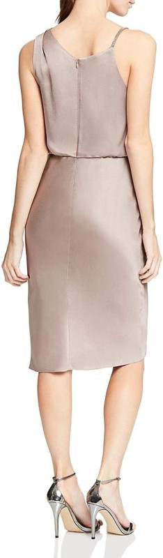 Halston Heritage heritage continues to shows its iconic style with minimalistic and effortless designs. This style showcases an asymmetric sleeveless cowl drape crepe back satin dress.