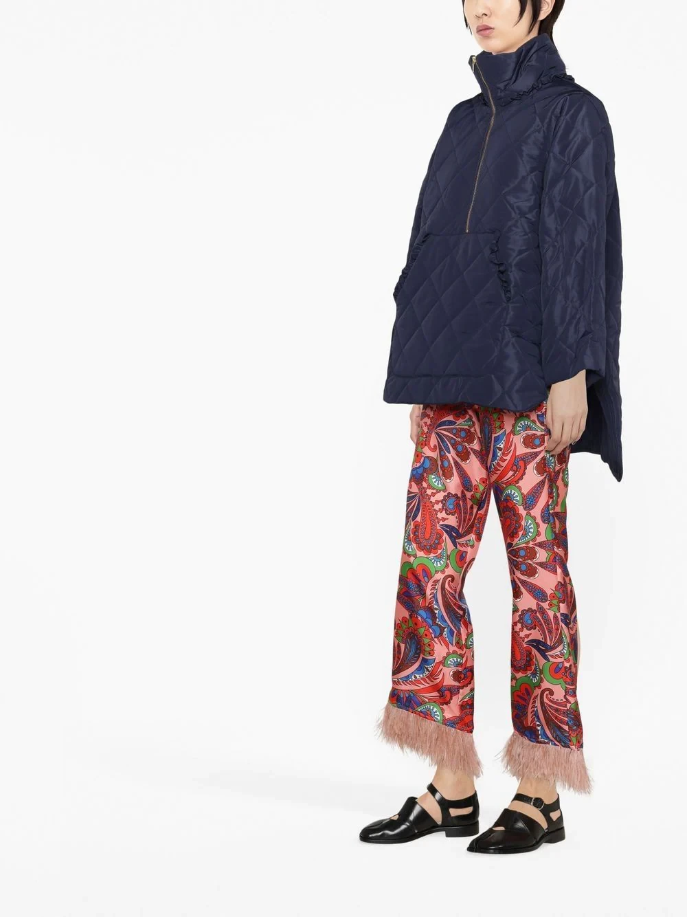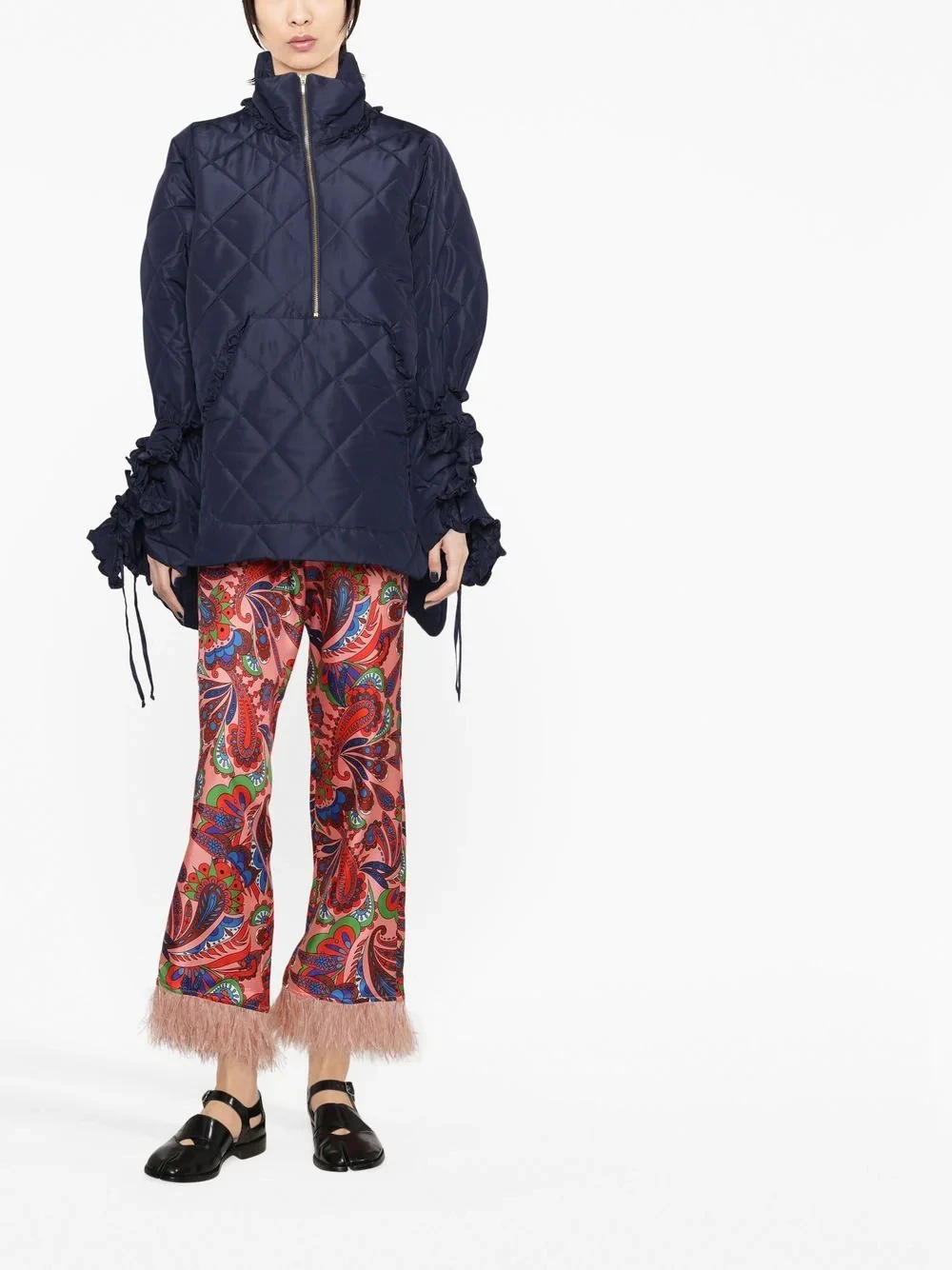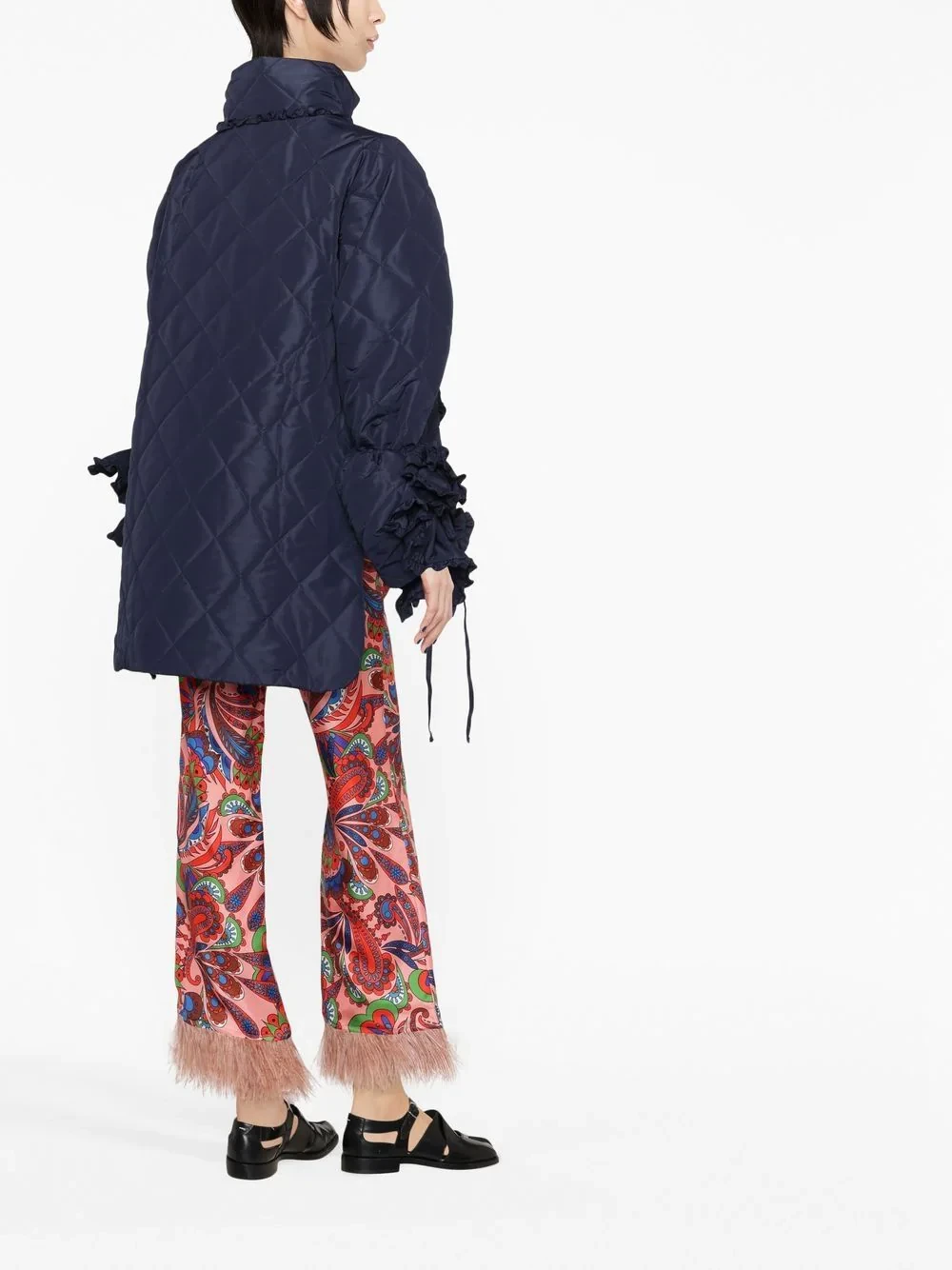 Kika Vargas offers a contemporary take on outerwear. This quilted iteration has an asymmetric hem and ruched detailing at the ruffled cuffs for a romantic feel.