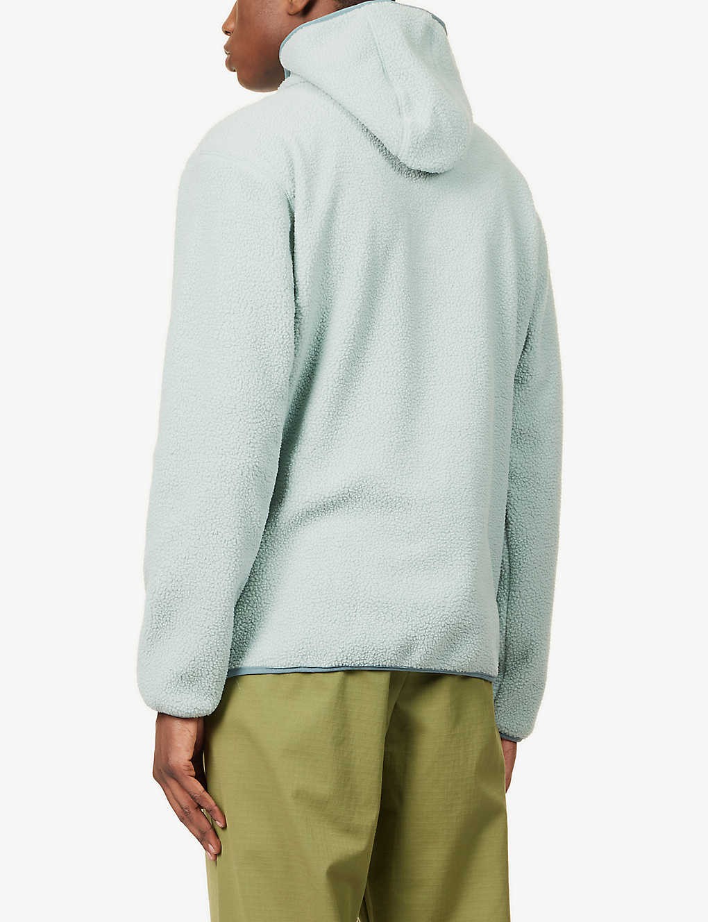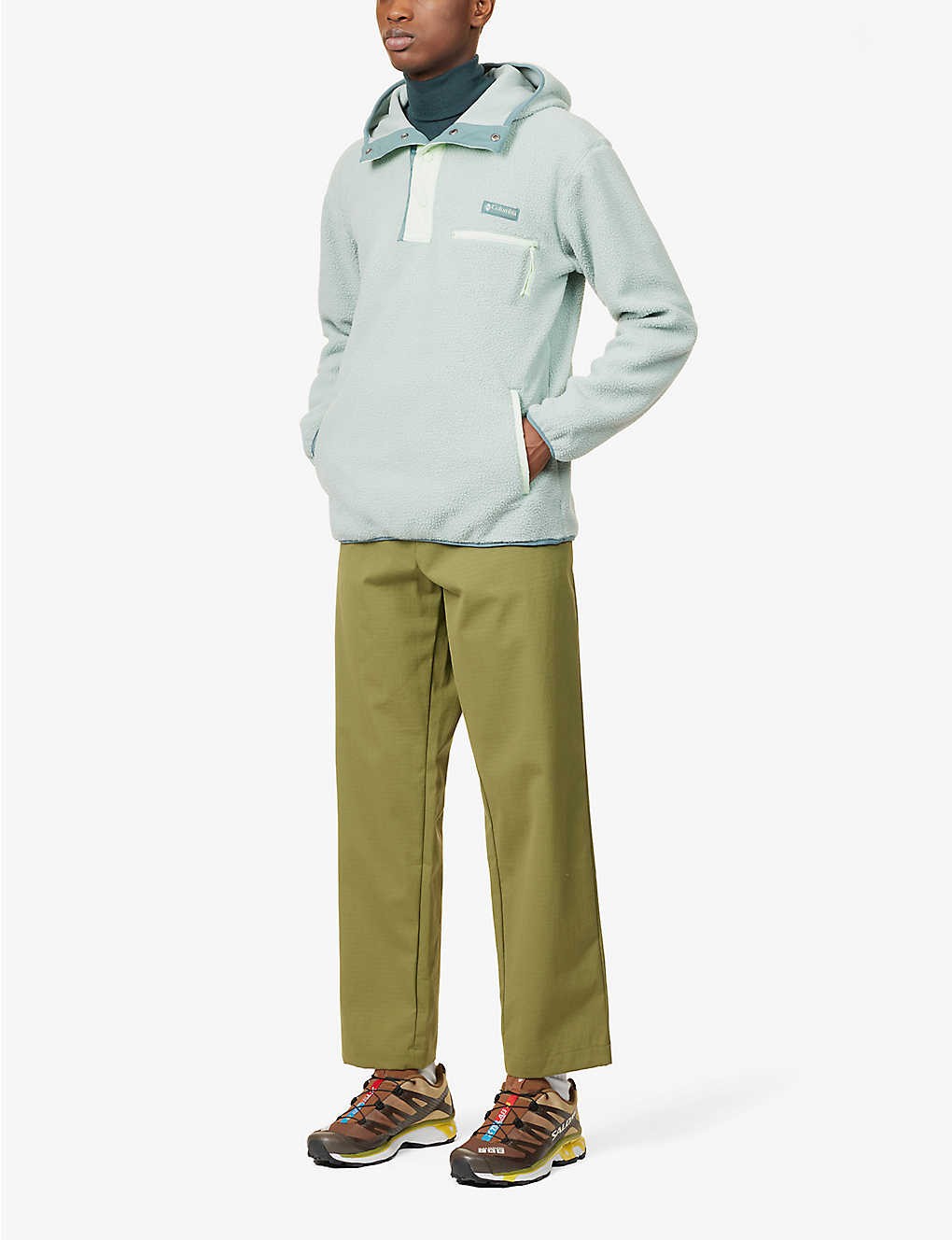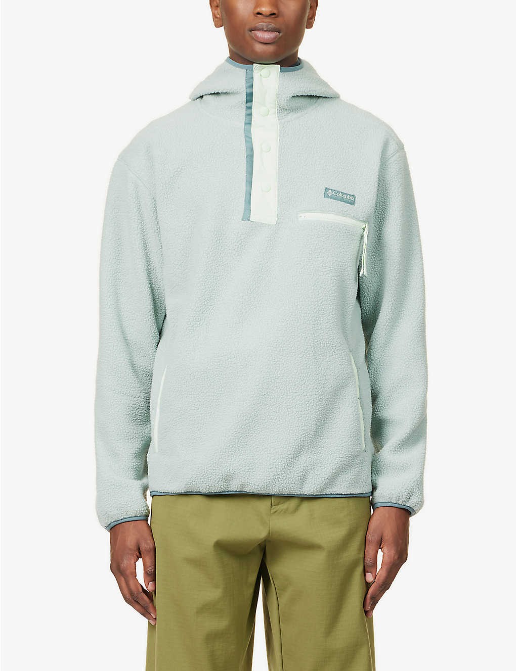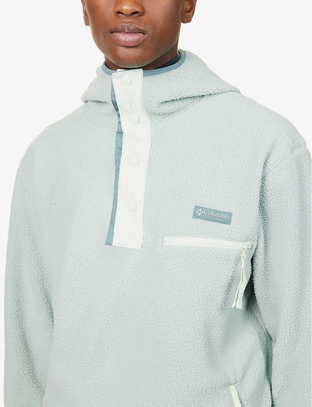 Relaxed fit, funnel neck, hood, long sleeves, contrast placket, branded hardware, branded print at chest, zipped pocket at chest, two slip pockets at sides, all-over fleece texture, contrast trims