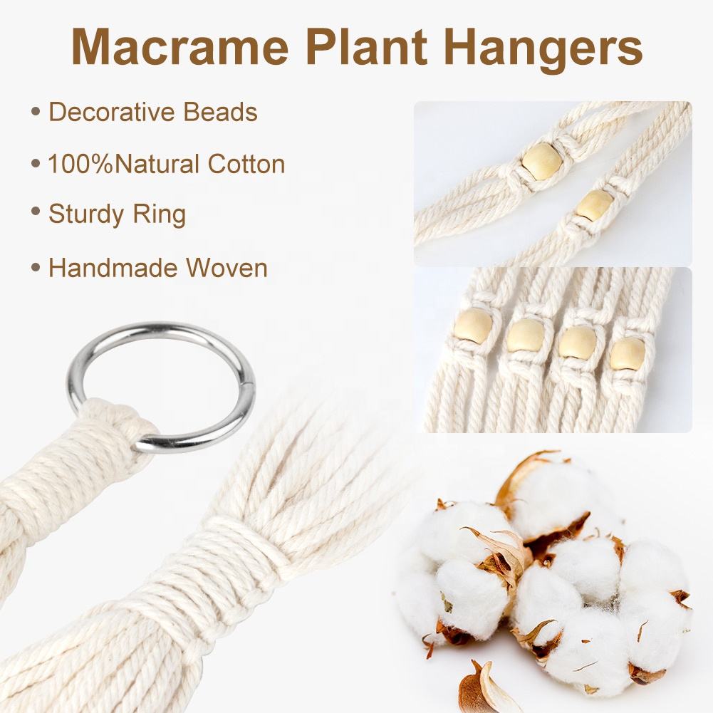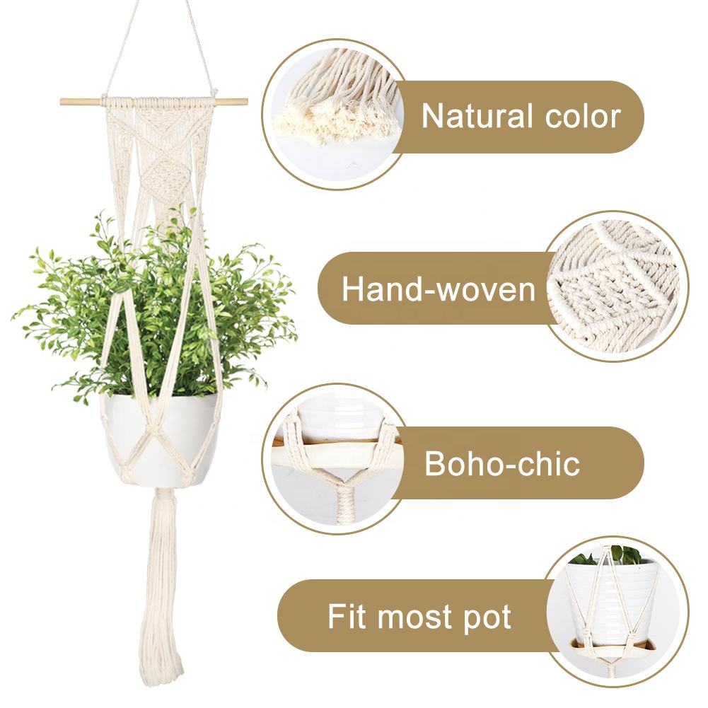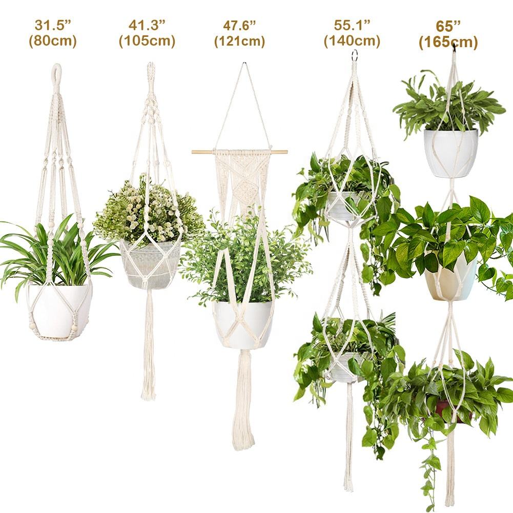 Essential details Type: Other Home Decor Place of Origin: Guangdong, China Brand Name: OurWarm Model Number: J-GS-HPBZ Material: Fabric Fabric Type: 100% Cotton Product Name: Macrame Plant Hanger Usage: Home Decoratiove Size: 80cm/105cm/121cm/140cm/165cm MOQ: 50 PCS Color: Ivory white Packing List: 1pc/bag Season: All-Season