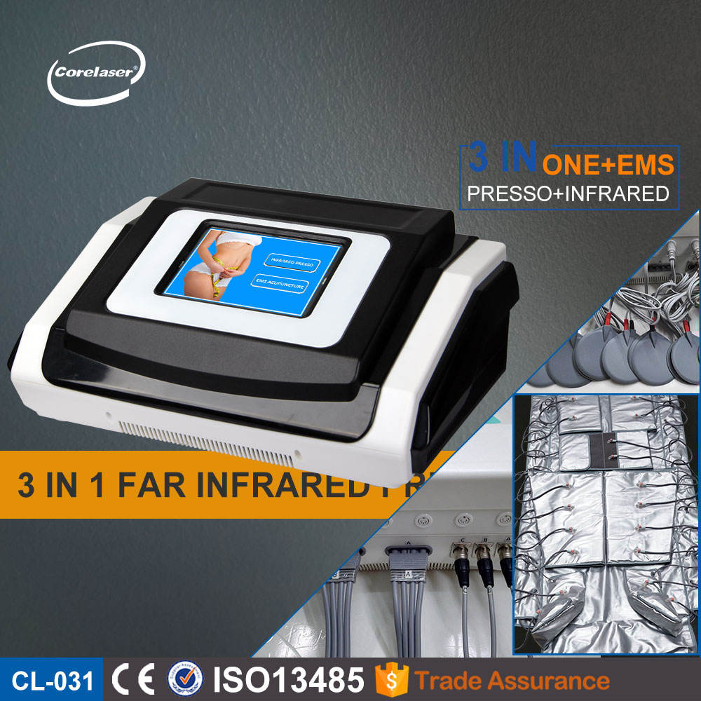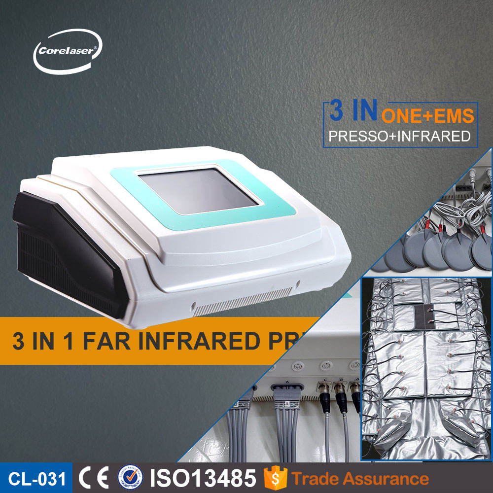 Essential details Place of Origin: Guangdong, China Brand Name: CORELASER Model Number: CL-031 Feature: Blood Vessels Removal, Anti-Puffiness, Detox, Breast Enhancers, Weight Loss, Cellulite Reduction Material: ABS Plugs Type: EU,CN,US,JP,OTHERS Waterproof: NO Target Area: Body Warranty: 1 Year Suit color: Sliver/blue(Optional) EMS pads: 8 pairs ODM/OEM service: available function1: Lymphatic drainage/Detoxing function 2: Slimming/ Muscle treatment/Weight loss Aipressure: 100mmHg - 120mmHg Operation System: Infrared Application: For Commercial After-sales Service Provided: Online support