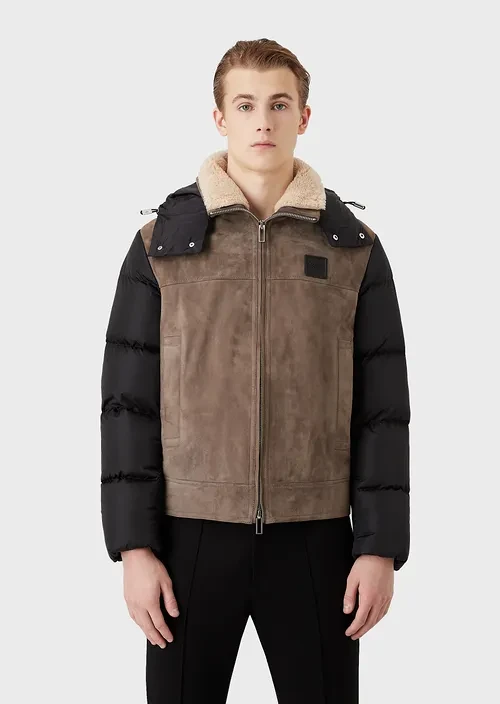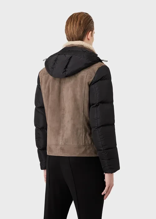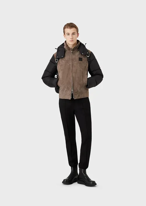 The convenience of versatile, practical outerwear, perfect for all your activities in the town or countryside. The exclusiveness of this style derives from the combination of textures, making it a choice to show off on various occasions. Jacket with goatskin suede body and genuine down padded, quilted sleeves and hood. Detachable details accentuate the garment’s urban, modern style: curly shearling lambskin detachable collar with buttons and detachable nylon hood with zip. Logo leather patch.