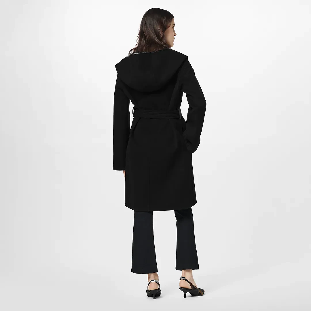 This Hooded Wrap Coat is a stylish piece that recalls the House's leatherwork savoir-faire. It is tailored in double cashgora, with a discreet Monogram interior. A belt cinching the waist and leather trimming on the inside add an extra touch of Louis Vuitton luxury.