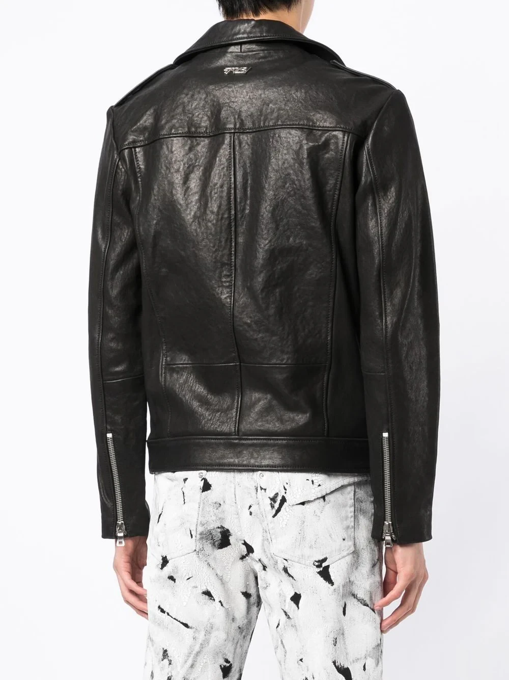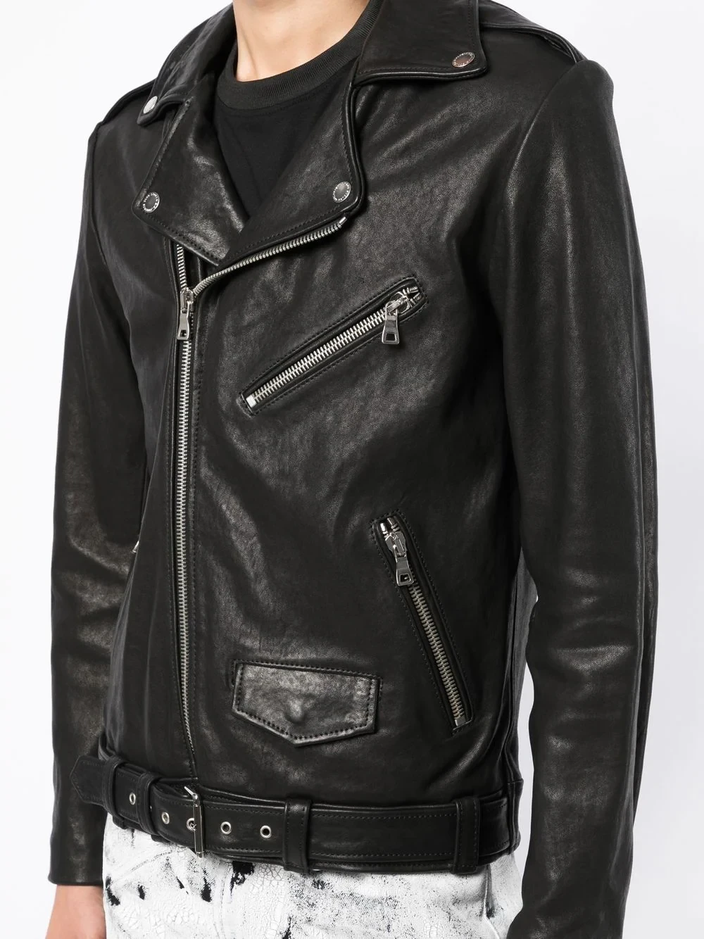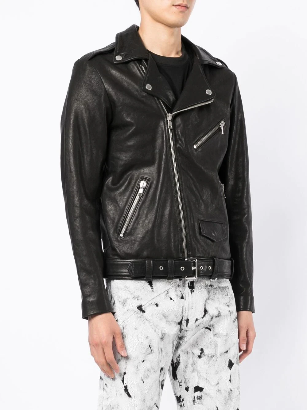 Joey leather biker jacket from Stolen Girlfriends Club featuring black, leather, notched collar, front zip fastening, long sleeves, zip-fastening chest pocket, two side zip-fastening pockets and belted waist.