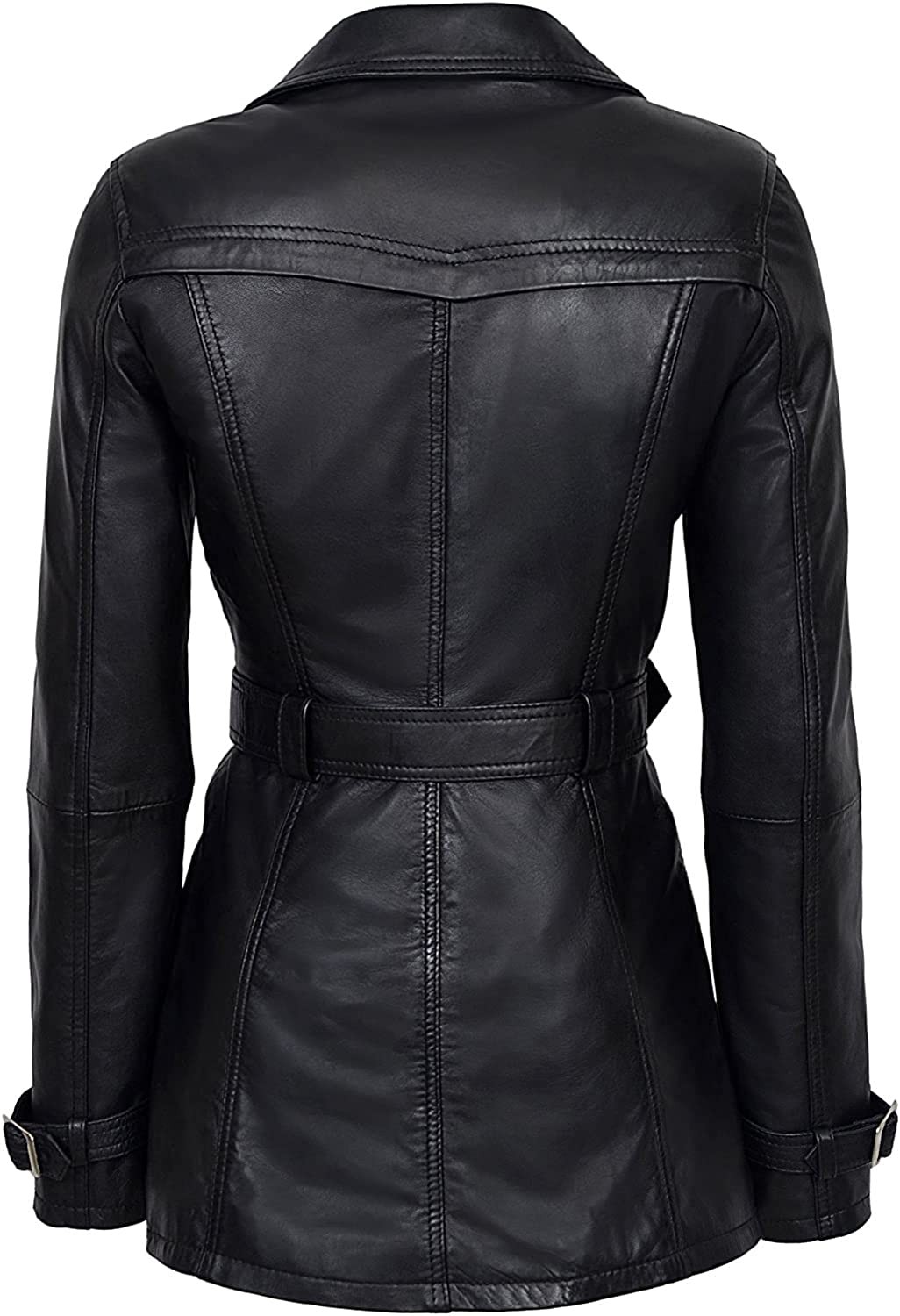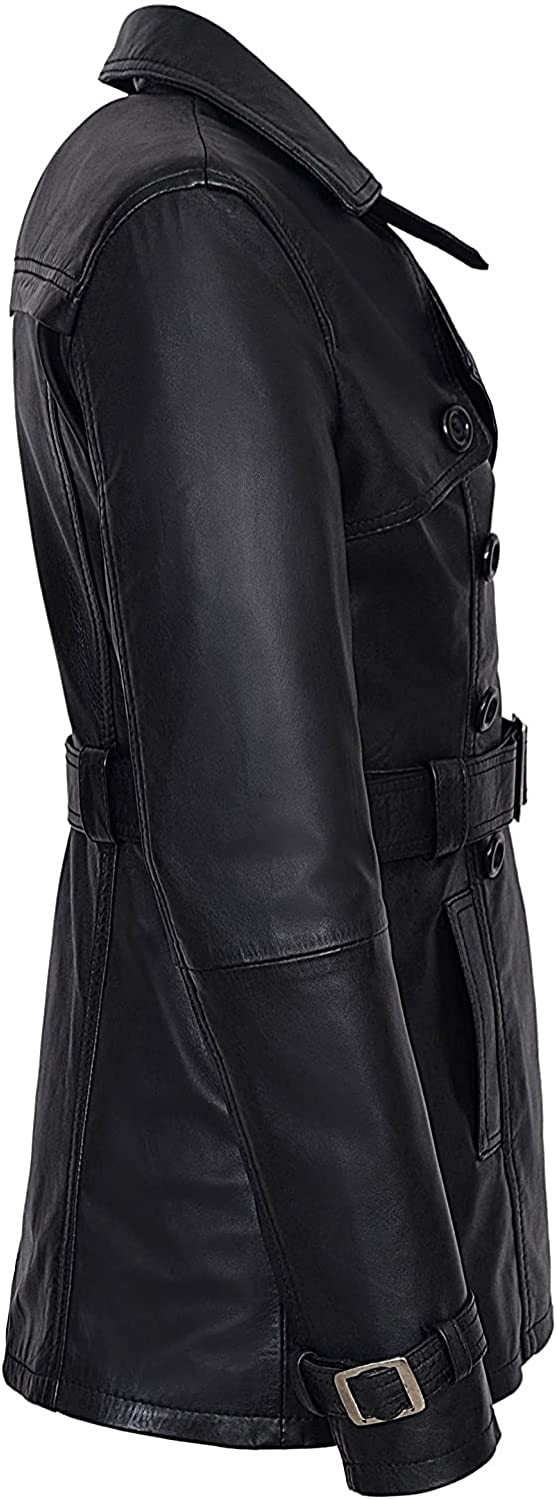 'TRENCH' Ladies BLACK Classic Mid-Length Designer Real Nappa Leather Jacket Coat. A True Classic design. Mid length. Made from real soft lambskin leather. Fitted Style. A very good quality jacket which will fit nicely on any Lady. Real leather ages beautifully with time. It takes on the character of the wearer. Natural leather is breathable so you wont feel sticky and suffocated