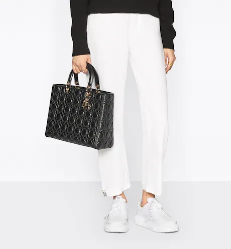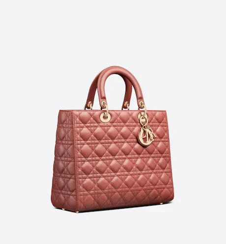 The Lady Dior handbag epitomizes the House's vision of elegance and beauty. Refined and sleek, this creation is timeless. Crafted in rust-color lambskin with Cannage stitching, it boasts an instantly recognizable quilted texture. The pale gold-finish metal 'D.I.O.R.' charms embellish and illuminate its silhouette. Featuring a thin, removable leather shoulder strap, the large Lady Dior bag can be carried by hand or worn crossbody.