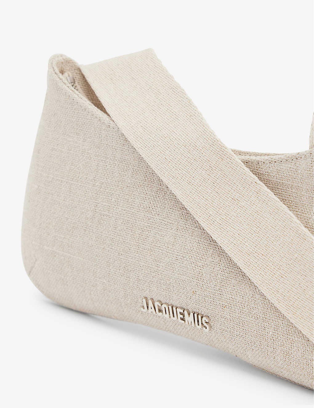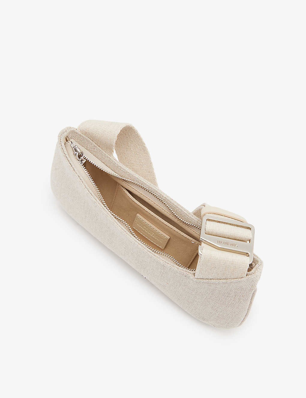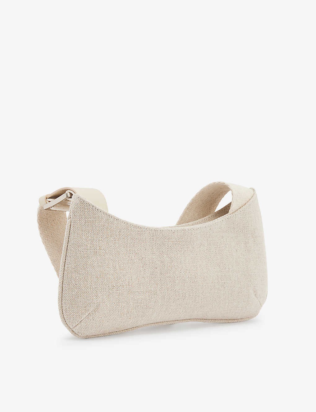 Adjustable shoulder strap, branded silver-toned hardware, metallic brand plaque at front, all-over woven texture, one main compartment, internal slip pocket, debossed brand patch at interior, fully lined