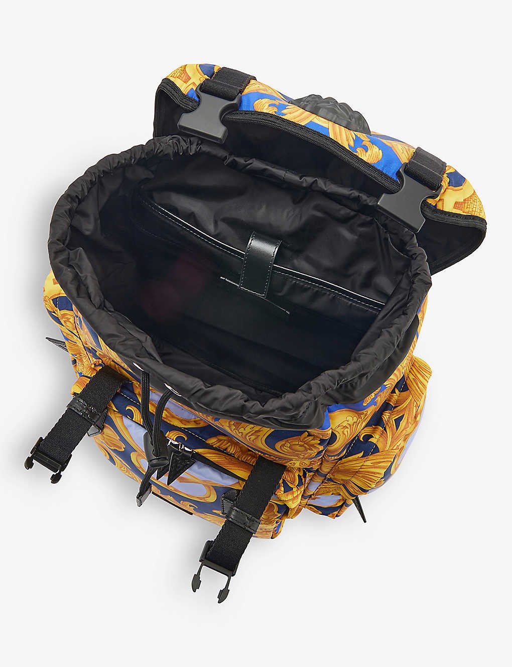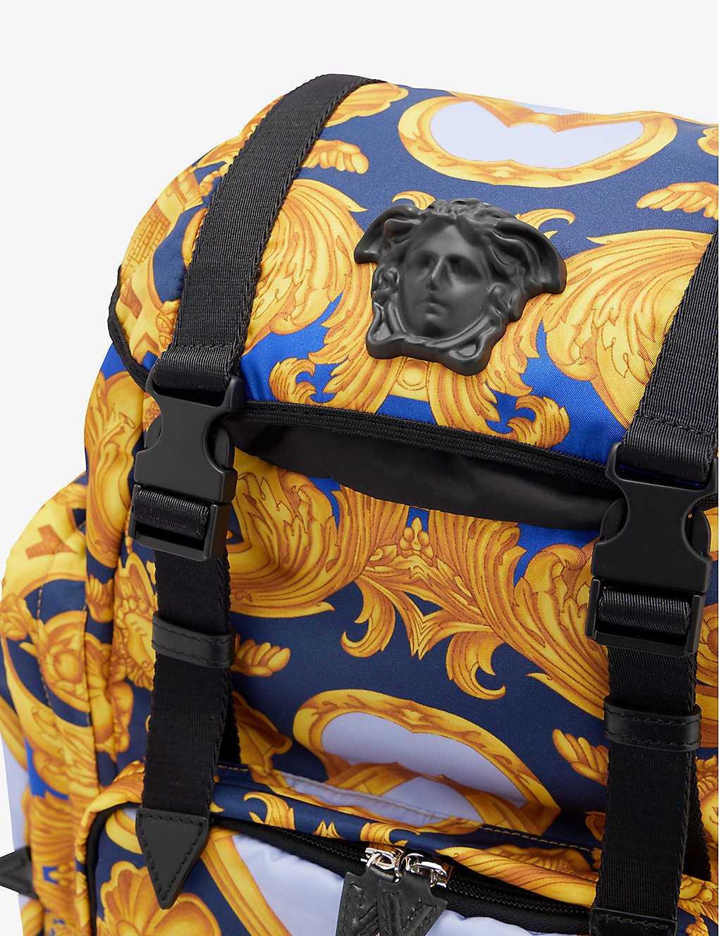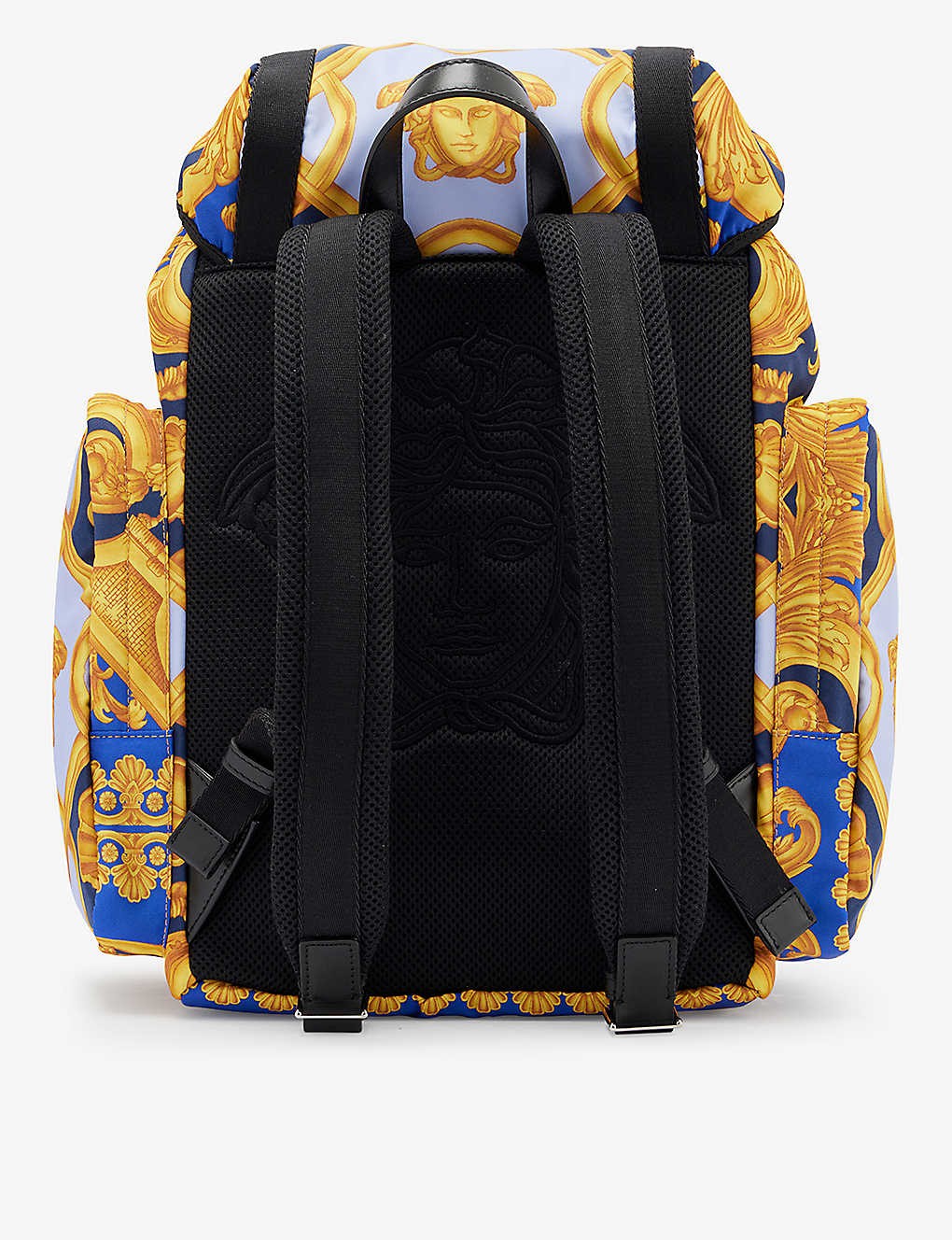 Top handle, adjustable shoulder straps, brand 'Medusa' plaque at top, brand patch at front, zip pocket at front and at sides, one main compartment, all-over brand signature print