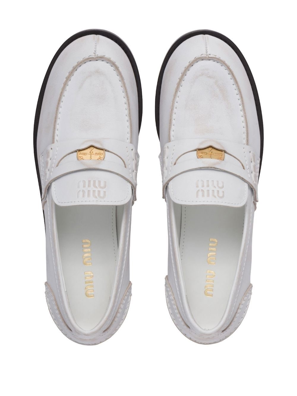 These loafers from Miu Miu are presented in white leather with a scuffed effect. Featuring a coin detail within the penny slot, these loafers take inspiration from preppy looks of the past and pay homage to the trend of inserting a coin in one's loafers which gave rise to the name penny loafer itself.