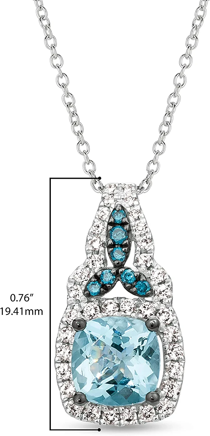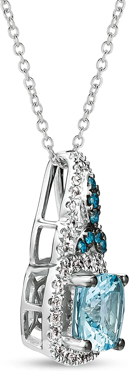 UNPARALLELED EXCELLENCE - This gorgeous 14kt Vanilla Gold pendant necklace from Le Vian centers on a brilliant blue cushion cut aquamarine gemstone. The hidden diamond bail features Blueberry Diamonds arrayed in a leaf pattern. The aquamarine and the blue diamonds both held in gunmetal rhodium plated tips and haloed by Vanilla Diamonds. The 18" 14kt white gold cable chain will keep this pretty pendant close to her heart. Make the most of the Le Vian Grand Sample Sale and grab it today!