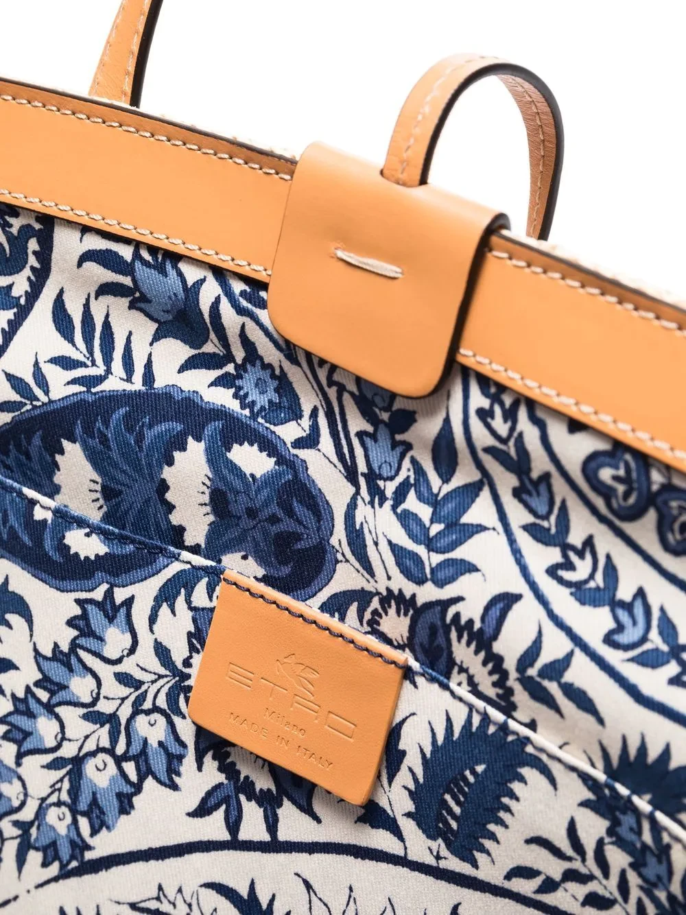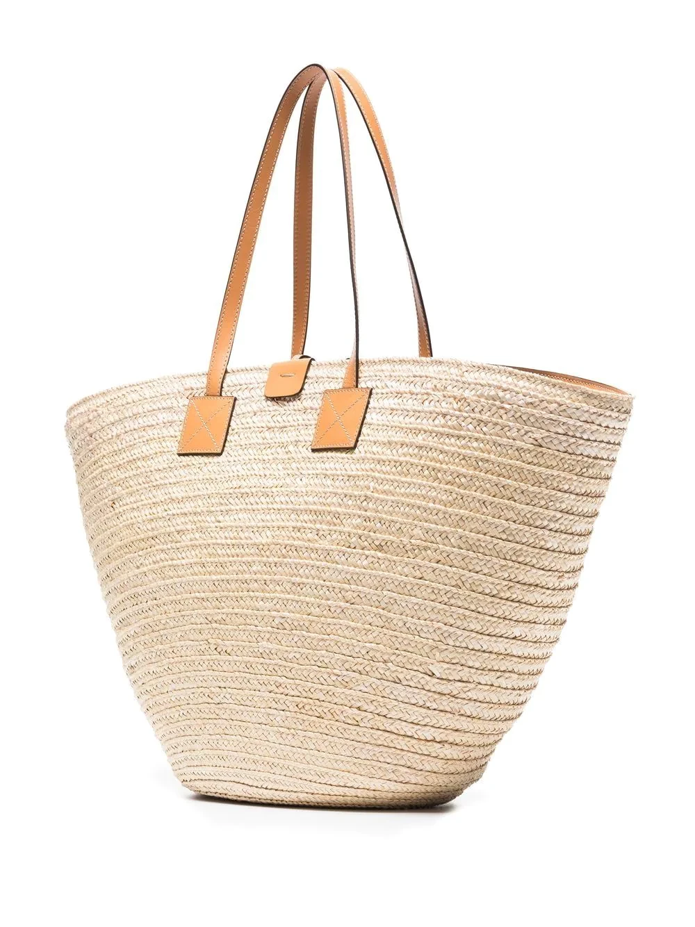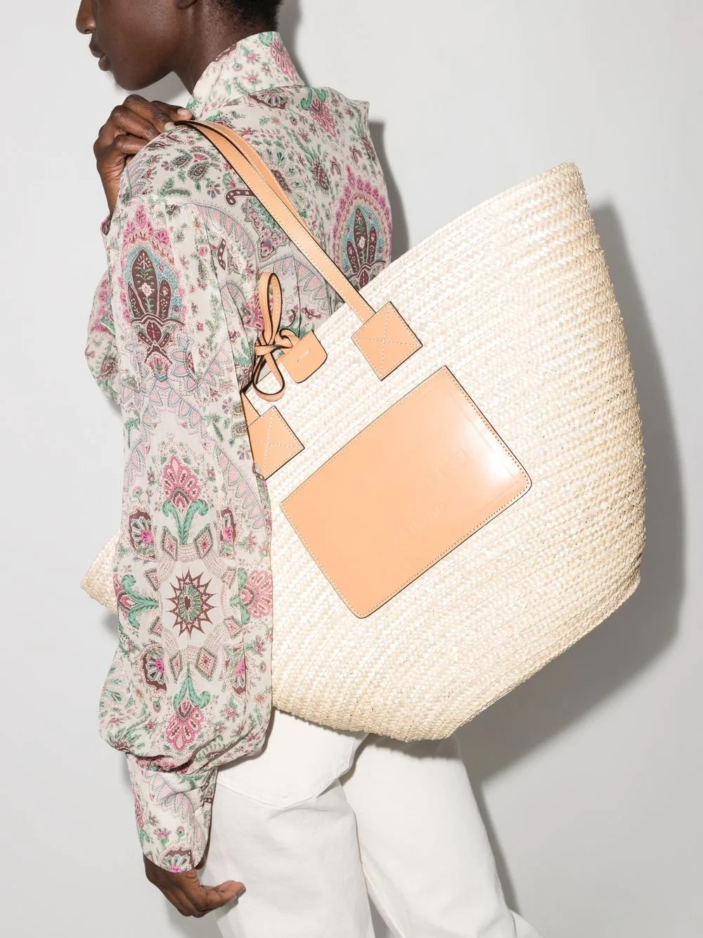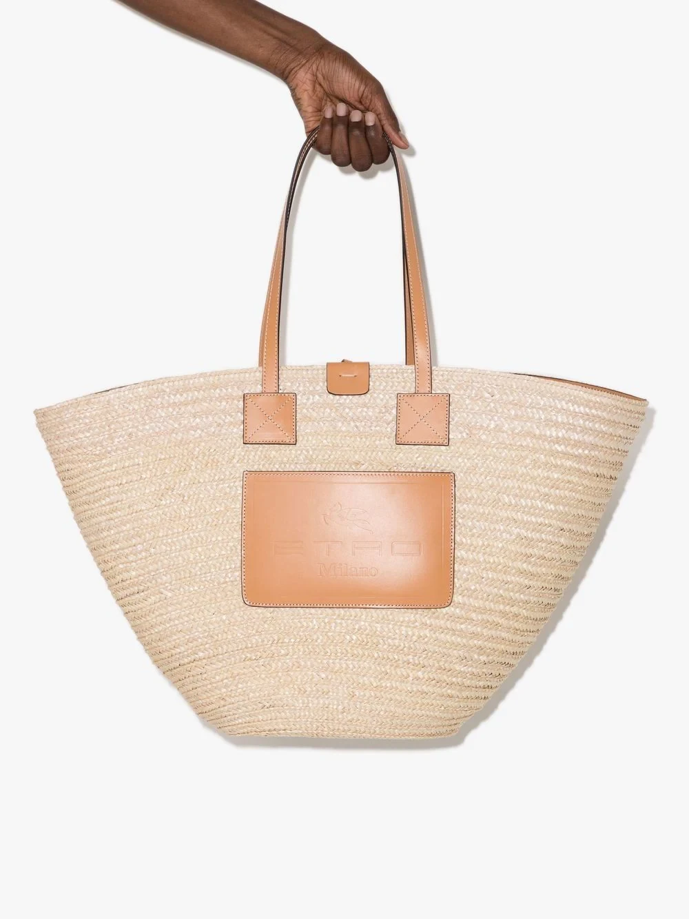 logo-patch raffia tote bag from ETRO featuring beige, woven raffia design, logo patch to the front, tie-top fastening, two rounded top handles and internal patch pocket