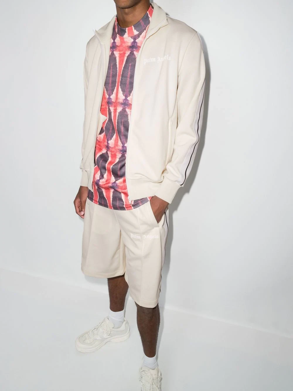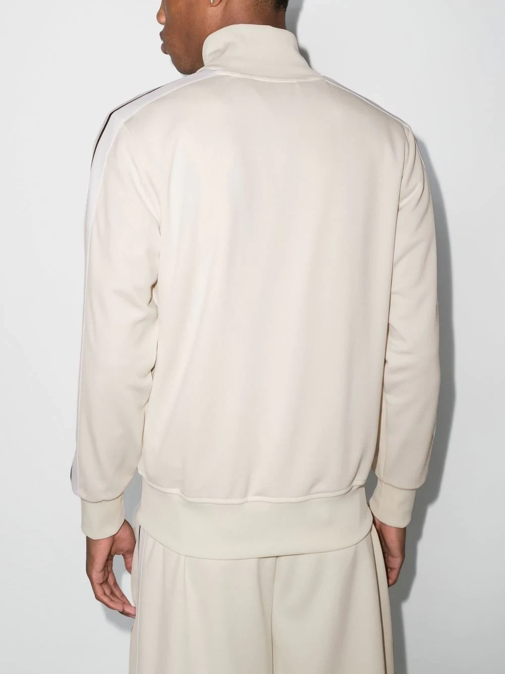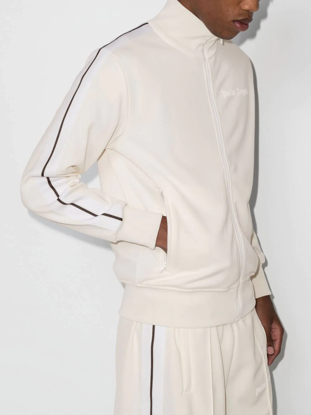 logo-print track jacket from PALM ANGELS featuring off-white, high neck, front zip fastening, logo print to the front, two side zip-fastening pockets, straight hem, drop shoulder, long sleeves and side stripe detailing.
