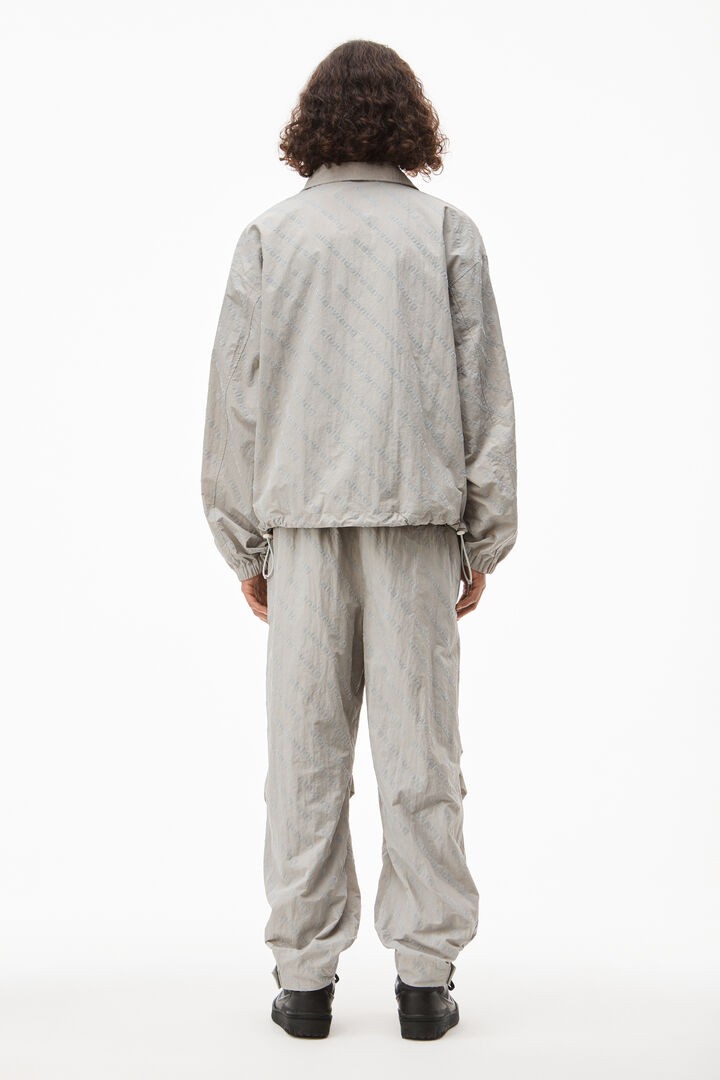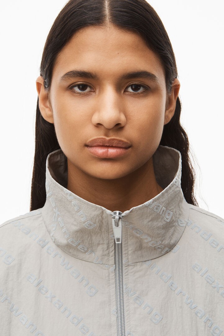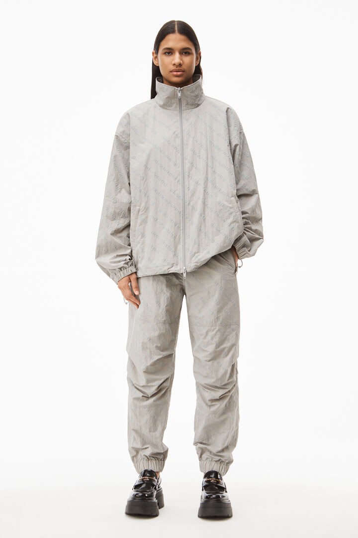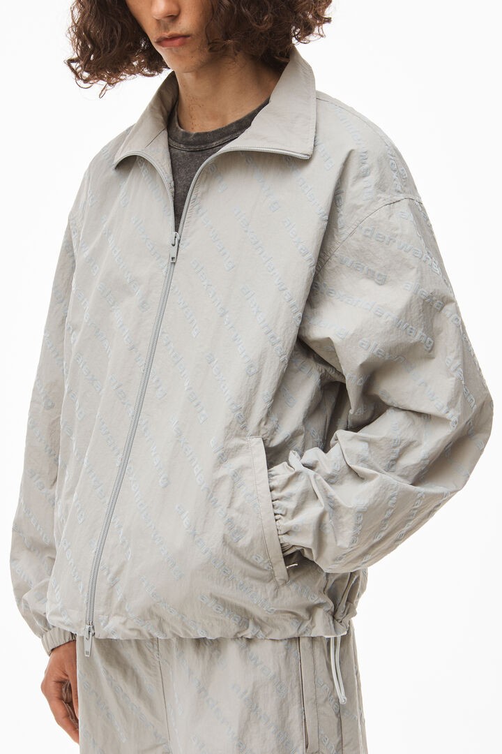 alloy track jacket with all over flocked logo, zip front, adjustable bungee and stopper trim at hem in crinkle nylon