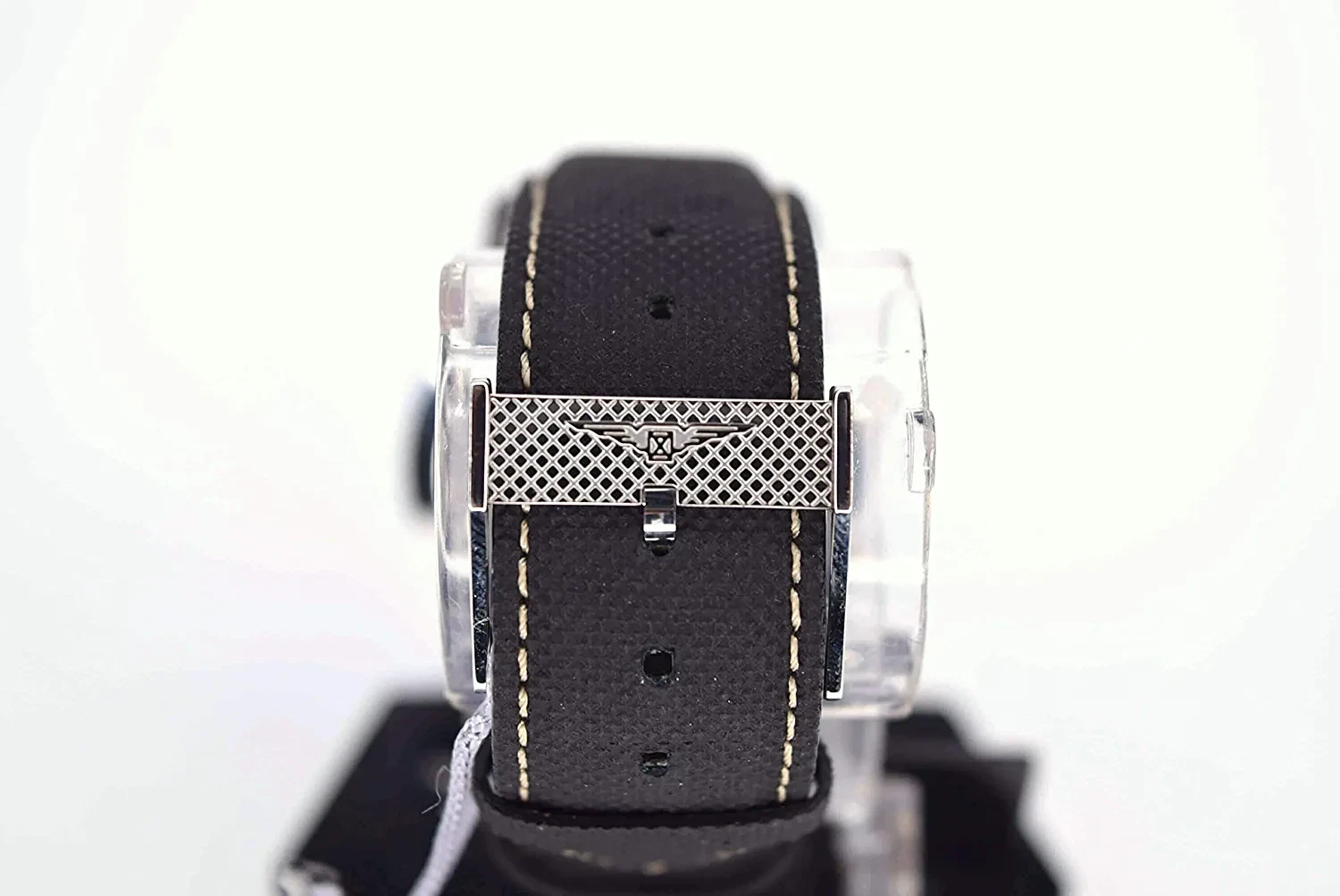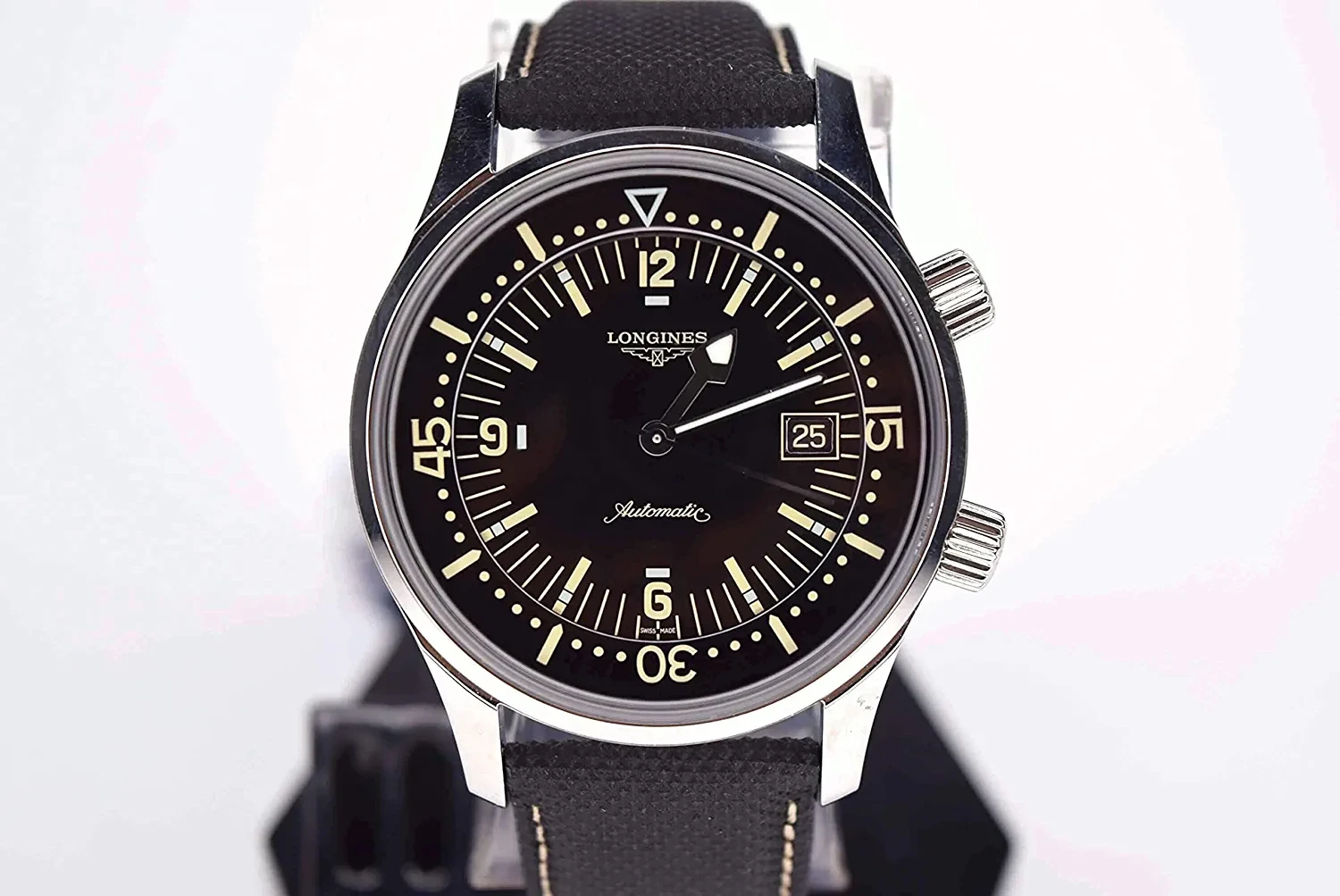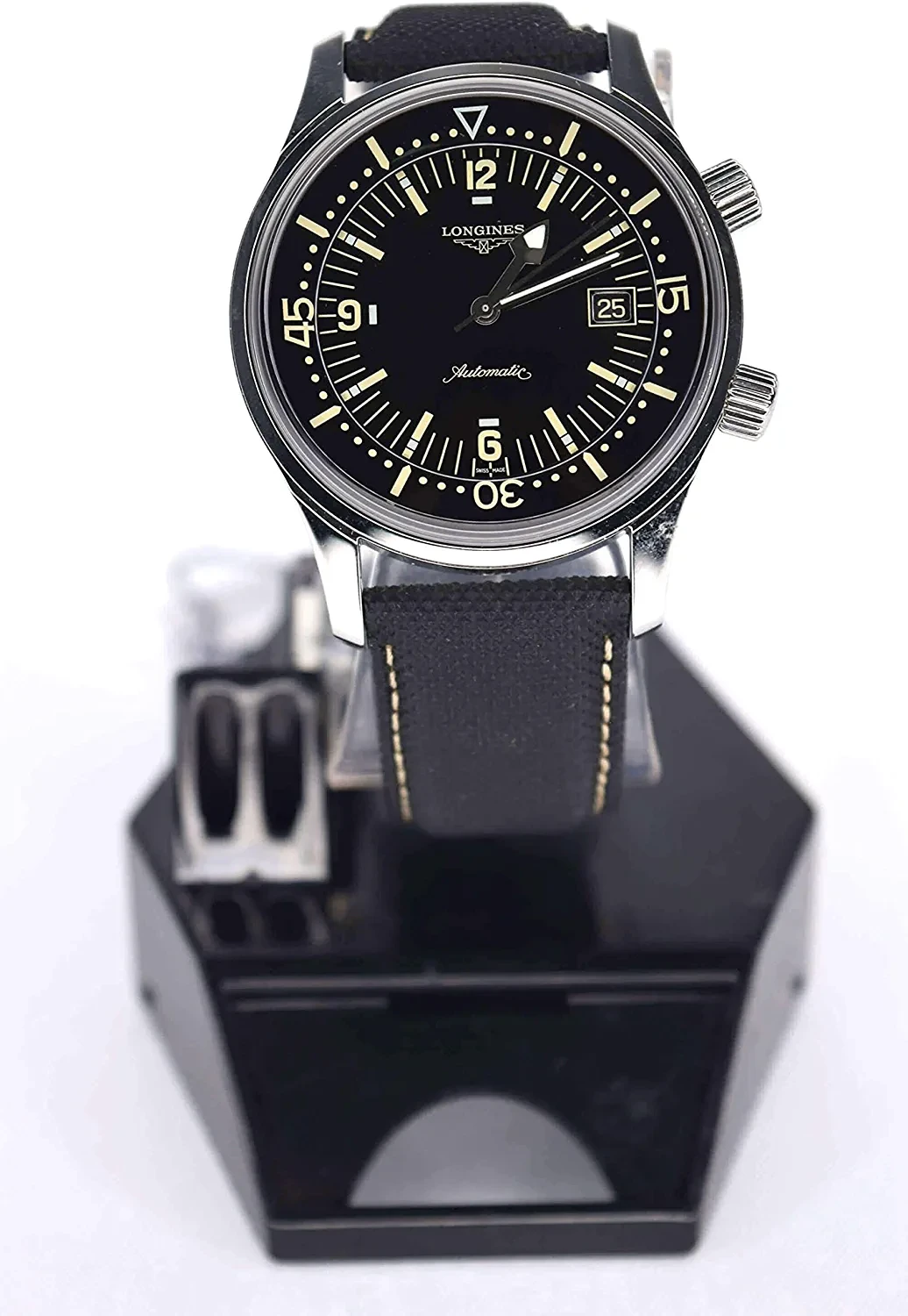 Black dial enhanced by luminous silver-tone hands. Silver-tone stainless steel case with a black fabric (leather backed) band. Automatic movement. 300 meters / 1000 feet water resistance. Bi-directional Rotating bezel. Scratch Resistant Sapphire crystal. Solid caseback. Tang clasp. Screw Down crown. Case size 42 mm. Band 22 mm x long. Longines L37744500 Legend Diver Watch.