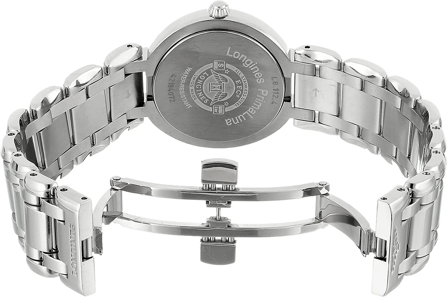 Stainless steel case with a stainless steel bracelet. Fixed bezel. Silver dial with blue steel hands and Roman numeral hour markers. Minute markers around the outer rim. Date display appears at the 3 o'clock position. Quartz movement. Scratch resistant sapphire crystal. Solid case back. Case diameter: 30 mm. Hidden folding clasp. Water resistant at 30 meters/ 100 feet. Functions: hours, minutes, seconds, calendar. Longines PrimaLuna Stainless Steel Ladies Watch L8.112.4.71.6.