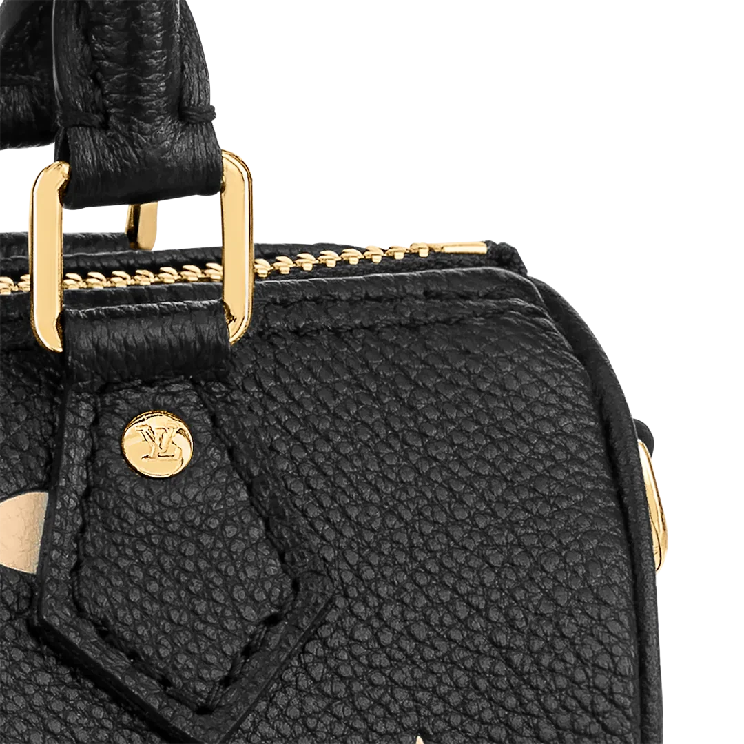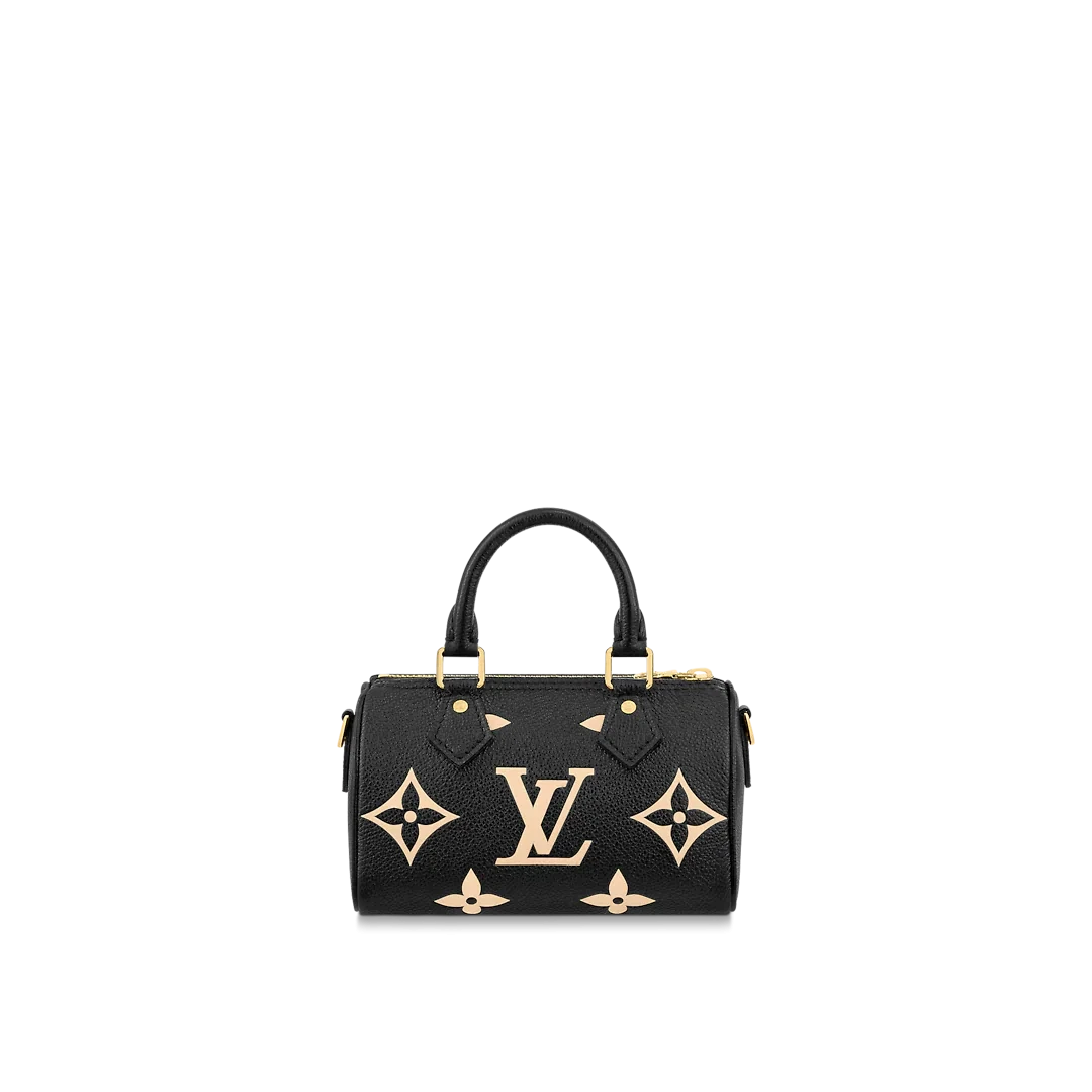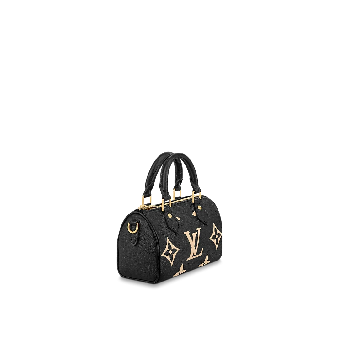 The Nano Speedy is crafted from supple, grained Monogram Empreinte leather, whose bicolor palette highlights the embossed Monogram pattern. This miniature replica of Louis Vuitton's iconic Speedy bag has a secure zip closure, while its two handles and removable, adjustable shoulder strap offer multiple carry options.